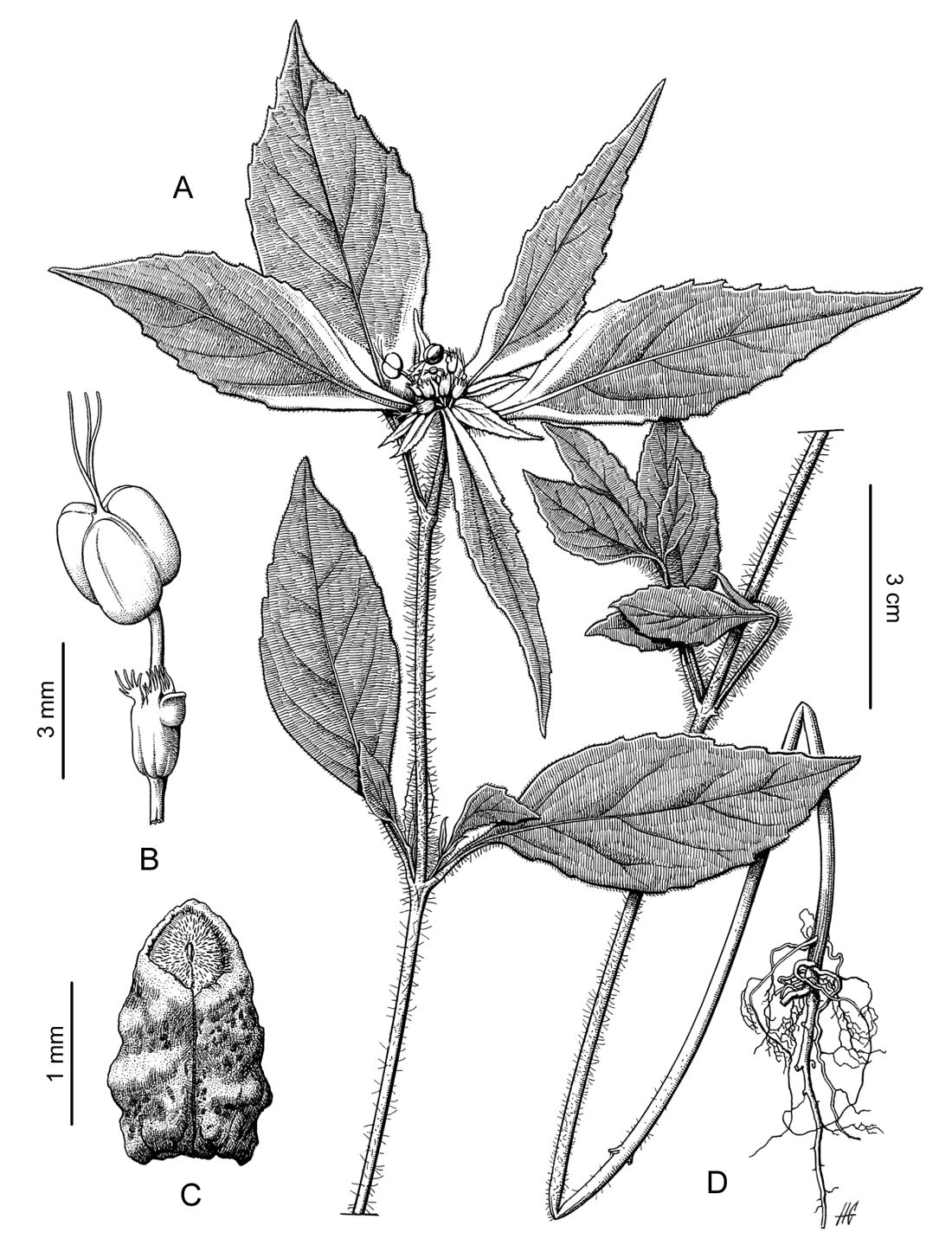 Hierbas anuales, hasta de 50 cm de alto, glabras; tallos erectos, ascendentes, con entrenudos de 2-9 cm de largo, ramas opuestas. Hojas con pecíolos de 3-7 mm de largo; láminas ovadas, de 10-33 × 10-20 mm, el margen dentado, indumento de tricomas verrucosos; láminas foliares por debajo de las inflorescencias blancuzcas, al menos en su porción basal. Ciatios en dicasios simples; involucros cilíndricos, de 2-2,3 × 1-1,2 mm, con indumento escaso; lóbulos rectangulares, levemente más altos que los nectarios, profundamente partidos; segmentos terminados en glándulas; nectarios 2-labiados. Flores estaminadas 15-20; bractéolas 2-partidas, eglandulosas, provistas de tricomas. Flores pistiladas con un breve rodete periántico; estilo 3, indivisos; estigmas 3. Fruto una cápsula globosa, de 3-3,6 × 4-4,5 mm, levemente deprimida. Semillas prismáticas, de 2-2,5 × 2,1-2,4 mm, tuberculadas; carúncula reniforme.