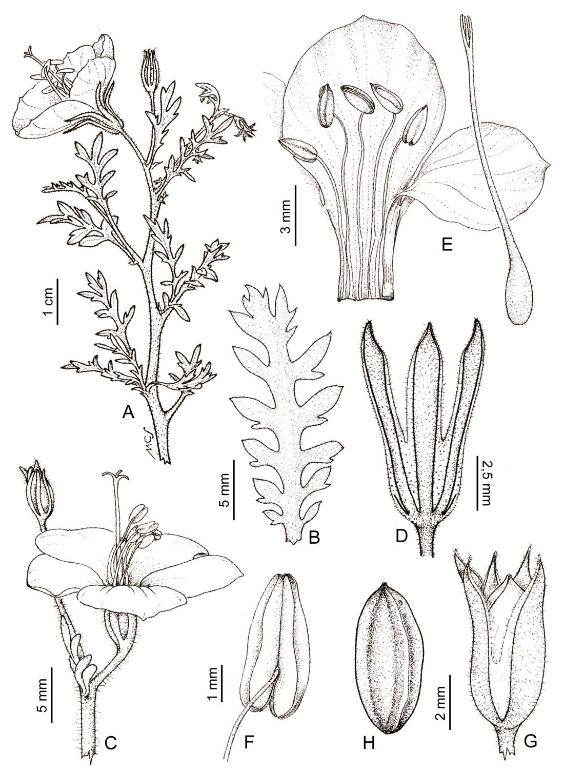 A. Porción de rama florífera. B. Hoja. C. Flor. D. Detalle del cáliz, mostrando los intervalos hialinos. E. Corola desplegada, mostrando la inserción de los estambres; ovario, estilo y estigmas. F. Detalle de la antera. G. Fruto con el cáliz persistente. H. Fruto.