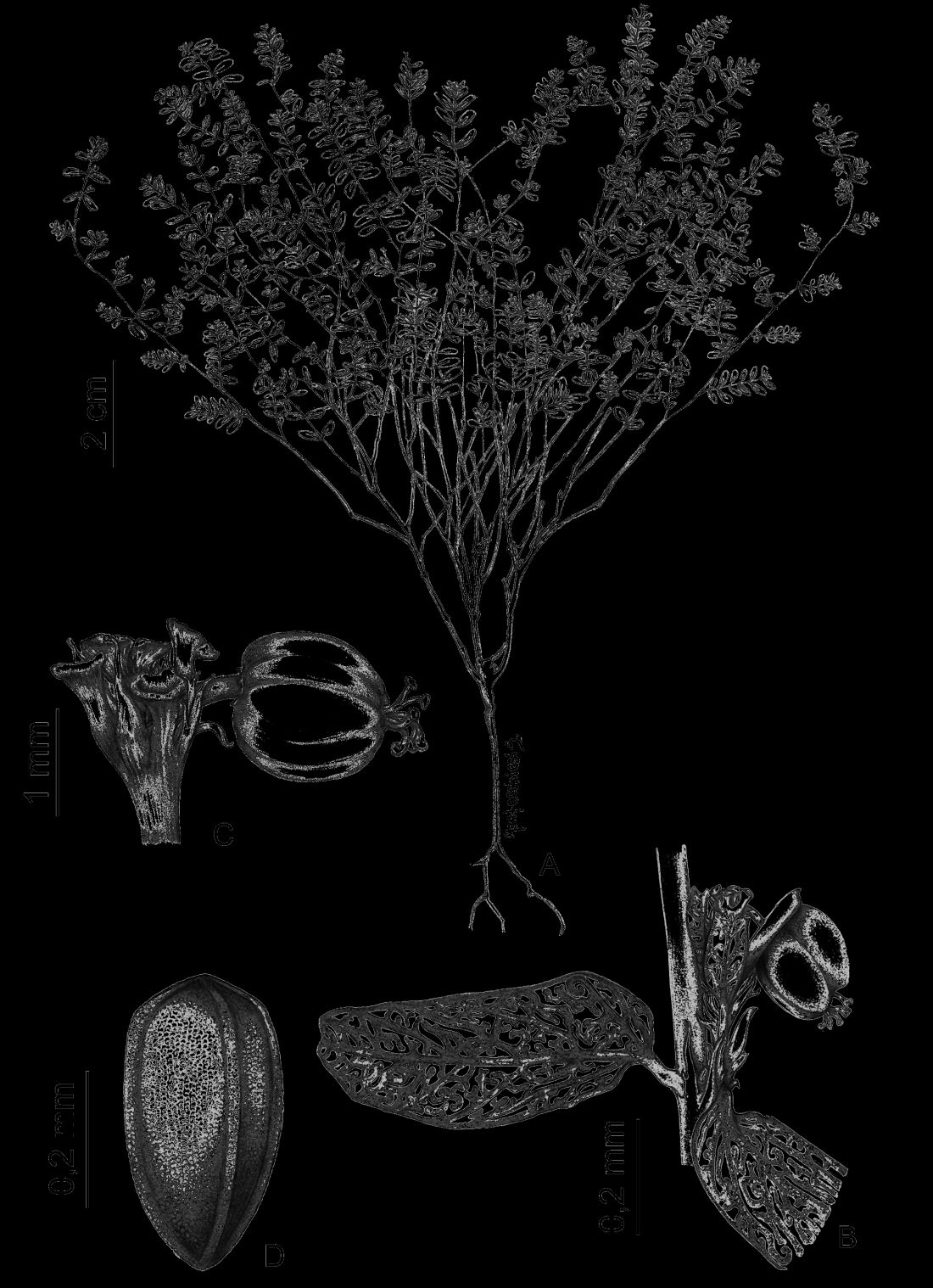 Hierbas perennes, ascendentes; tallos de ramificación dicotómica, con ramas hasta de 20 cm de largo, glabras. Hojas con pecíolos hasta de 0,5 mm de largo; láminas elípticas, de 7-7,5 × 3-3,5 mm; estípulas 3-dentadas, con el diente central más largo, libres en ambos lados, membranáceas. Ciatios solitarios, axilares; involucro acopado, de 1-1,2 × 1-1,3 mm; nectarios 4, ovados, cóncavos, con apéndices lobulados, lóbulos triangulares 3-dentados con el diente central grande y los laterales pequeños. Flores estaminadas 10; bractéolas triangular-subuladas. Flores pistiladas aperiantadas; ovario glabro, estilos largos, 2-fidos en la mitad distal. Fruto una cápsula subcónica, de 2,3 × 1,7-2 mm. Semillas ovoideo prismáticas, de 1,2-1,4 × 0,5-1 mm, con algunas depresiones en el lado ventral.