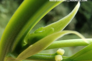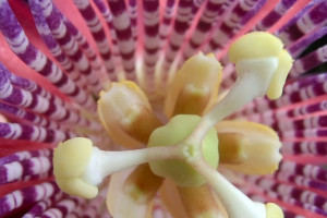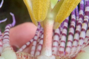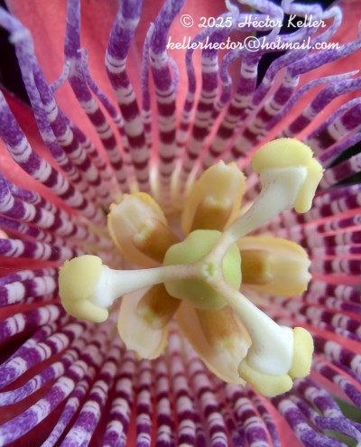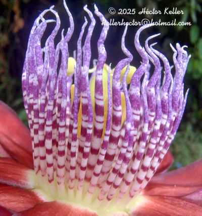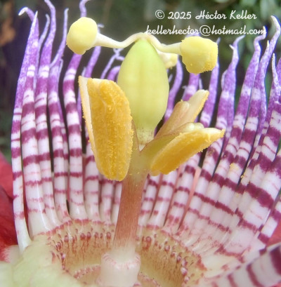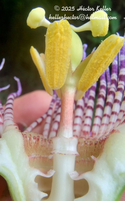 Lianas hasta ca. 3 m de largo, glabras; tallos leñosos, cuadrangulares, con alas laminares de 0,5 cm de ancho; zarcillos verde brillantes; estípulas ovadas, de 7-15 × 2-5 mm, de base ensanchada y con márgenes enteros. Pecíolos de 20-45 mm de largo, provistos de 2 a 4 glándulas ciatiformes opuestas, de 1,8-2 × 0,6-1 mm, ubicadas en su mitad superior. Láminas ovadas, de 90-150 × 70- 140 mm, de base truncada, ápice con un apículo de 1-2 mm de largo, los márgenes enteros, con un nervio central y 4-6 nervios laterales a cada lado, crasas, cara adaxial verde brillante, la cara abaxial verde clara. Pedúnculo anguloso de 15-25 mm de largo, solitario; brácteas verticiladas, libres en la zona apical del pedúnculo, foliosas, ovadas, de 15-18 × 7-12 mm, de base truncada, verde brillantes, con glándulas sésiles sobre el margen aserrado; pedicelo floral de 5-10 mm de largo, terete, verde-rojizo. Flores sublaterales, semipéndulas, de 65- 85 mm de diámetro, con perfume seco, similar al piretro; hipanto de 11-15 mm de largo; copa floral de 6-7 mm de largo, introrsa en la base, tubo floral levemente campanulado, de 5-8 mm de largo, angostado entre la copa y el tubo; sépalos oblongos, de 30-50 × 13-16 mm, truncados en la base, cuculados, con un apículo de 0,2-0,5 mm de largo, margen entero, hialino, carnosos, cara adaxial blanco-violácea a violácea, verdosa hacia los márgenes, cara abaxial verde o blancorosada, de acuerdo a la posición del sépalo en la prefloración; pétalos oblongos, de 30-40 × 10-15 mm, truncados en la base, carnosos, con la cara adaxial violáceo-rojiza, cara abaxial violácea; corona con los radii en 2 series, filiformes, de 30-35 × 1,5 mm, blancos, con franjas transversales violeta y lila de distinto tamaño, ápice ligeramente tortuoso; pali capilares en 1 serie, de 3 mm de largo, apéndices ubicados desordenadamente en una extensión de 3 mm, violáceos; operculum de 3-5 mm de largo, horizontal o erecto, blanco, margen ligulado; anillo nectarífero de 5 mm de largo; limen de 7-8 mm de largo, violeta oscuro, carnoso, prominente, de forma anular alrededor del androginóforo, debajo de la trochlea, ésta de 3 mm de largo; androginóforo de 15-18 × 1,5-2 mm, porción superior del filamento estaminal libre ca. 8 × 3 mm, blanca y con pequeñas líneas rojizas; anteras de 9-10 × 3-4 mm, perpendiculares al eje del filamento, blancas y con líneas rojizas; ovario obovoideo, ca. 35 × 8 mm, sobre un ginóforo de 2-2,5 mm de largo; estilos de 6 × 1-1,5 mm, verdeamarillentos y con pequeñas líneas rojizas; estigmas ca. 4 mm de diámetro, papilosos. Bayas de contorno obovado o subesférico, de 65-100 × 50-90 mm, péndulas, coriáceas, amarillas cuando maduras; endocarpo carnoso, corchoso cuando seco. Semillas obovoideas, de 5-8 × 4-6 mm, apiculadas, con margen sulcado, testa reticuladofoveolada; retículos de 4-6 lados, con ca. 25 fóveas por cara; testa de color crema claro; arilo negruzco-transparente.