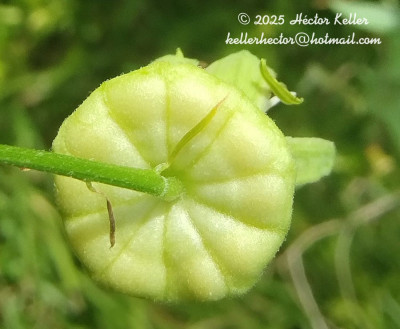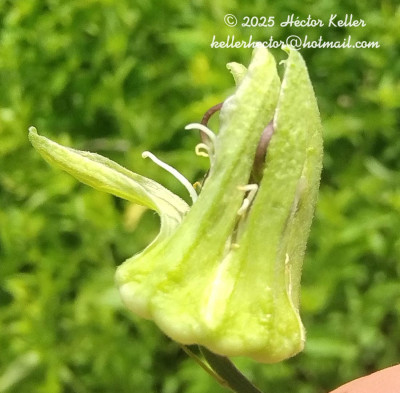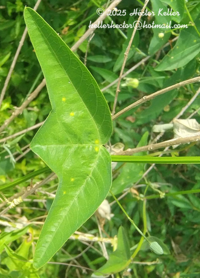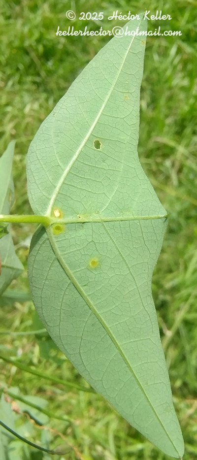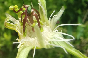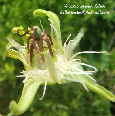 Lianas de 1-3 m de largo, glabras a ligeramente pubescentse; rizoma leñoso, de 5-7 mm de diámetro; tallos volubles, herbáceos a leñosos, angulosos. Pecíolos de 5-21 mm de largo. Láminas de contorno transversalmente elíptico, de 5-40 × 40-120 mm, base a menudo subcordada, levemente carnosa a coriácea, dividida 10- 40% de prufundidad en 3 lobos apiculados, los laterales subovados a subtriangulares, en un ángulo mayor de 90º en relación al lóbulo central, éste semicircular hasta apenas insinuado, apículo de 1-2 mm de largo; lobos de borde entero, cara adaxial verde lustrosa, la abaxial más clara, cada uno con un nervio principal y ramificaciones laterales, más notorias y oscuras en la cara abaxial; esta cara también presenta glándulas circulares, de 0,5-2 mm diámetro, amarillas, dispersas y 2 ocelos en la base de la lámina entre la vena central y las laterales. Pedúnculos de a pares, de 25- 60 mm de largo, levemente pilosos cuando jóvenes; brácteas alternas o verticiladas en el ápice del pedúnculo, lineares, de 2-5 × 0,2-0,3 mm, enteras ó ramificadas; pedicelo floral de 2-3 mm de largo, ligeramente pubescente. Flores de 30-45 mm diámetro; hipanto de 3-5 mm de largo, copa floral de 1,5-3,5 mm de largo, introrsa en la base, tubo floral levemente campanulado en la mitad superior, de 1,5-3,5 mm de largo, con un angostamiento entre la copa y el tubo; sépalos ovados, de 13-16 × 4-6 mm, de ápice agudo, engrosado, cara abaxial de color verde muy claro en ocasiones ligeramente pilosa, cara adaxial verde claro con bordes hialinos; pétalos lineares, de 7-10 × 0,1-2 mm, de ápice redondeado, hialinos, blancuzcos; corona con los radii en 1 serie, filiformes, de 11-16 × 0,2-0,6 mm, blancos, con una banda transversal violácea de 2 mm en la mitad inferior; pali en 1 serie, capitados, de 2,5-4 × 0,3-0,7 mm, blancos, ápice de 0,5 × 1-1,2 mm, también blanco; operculum erecto, de 1,8-3 mm de largo, plicativo, carnoso, blanco, con los pliegues divididos y apiculados en la mitad o tercio superior; anillo nectarífero carnoso, ca. 0,2 mm de largo; limen de 0,5-3 mm de largo, carnoso, adnato al hipanto, elevándose luego en una membrana de 0,5-2 mm de largo, blancuzco; androginóforo de 7- 10 × 1-1,1 mm, suave a fuertemente violáceo; porción superior del filamento estaminal libre de 5-7 × 0,8-1 mm, verde, con la mitad superior violácea; anteras de 4,5-5,5 × 1-2,2 mm, amarillo-verdosas; ovario ovoideo, de 2-3,5 × 1-2,2 mm, glabro a pubescente, verde, ginóforo de 1 mm de largo, al madurar el fruto se alarga de 2 a 4 mm; estilos de 4-8 × 0,3-0,5 mm, violáceos; estigmas papilosos, de 1-1,8 mm de diámetro, amarillo-verdosos. Bayas esféricas, de 12- 16 mm de diámetro, exocarpo delgado, pruinoso, negro-morado a la madurez, mesocarpo corchoso, blancuzco. Semillas de contorno obovado, subtetraédricas, de 3-5 × 2-3,5 mm, ca. 0,8 mm de grosor; testa de cada cara estriada verticalmente, con 6-9 costillas transversales no muy elevadas, romas, ve