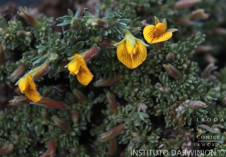 Perenne, leñosa, en cojín denso folioso, cubierta de pubescencia aplicada, densa. Raíz poderosa, leñosa, retorcida; ramas numerosas, entrenudos muy cortos, cubiertas por las estípulas persistentes, imbricadas, agudas. Hojas generalmente 3-yugadas, pecío¬los breves; folíolos lanceolados a obovados, pubescentes en ambas caras. Flores de 10-15 mm, solitarias, axilares, sobrepasando el denso follaje, amarillas con líneas castaño-pur¬púreas; cáliz muy pubescente con dientes anchos, subagudos, desiguales, iguales o apenas más largos que el tubo; vexilo muy pubescente exteriormente; alas y quilla glabras con uña más corta que la lámina; corola, estambres y cáliz persistentes envolviendo el lomen¬to. Ovario recto, estilo pubescente en la mitad inferior. Lomento con brevísimas emer¬gencias plumosas en los artejos apicales, dehiscente sin dejar semirreplo.