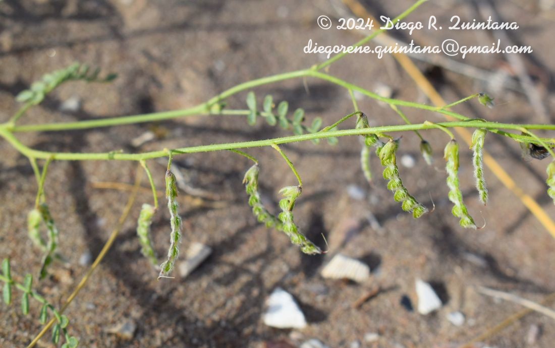 Herbácea de 10-50 cm alt. Raíz única, delgada, vertical, amarillenta. Tallos varios, ascendentes a erectos, glabrescentes a pubescentes, amarillentos. Hojas de 30-50 mm, pe¬cioladas, 5-8-yugadas; folíolos de ± 4-6 x 2-3 mm, elípticos a orbiculares, dispuestos la¬xamente sobre el raquis; pubescencia corta, suave en ambas caras, de pelitos blancos que dan una coloración grisácea y algunos glandulosos. Racimos simples, alargados, laxos, so¬brepasando las hojas. Flores pediceladas; pedicelos de 3-5 mm, hispídulos, glandulosos; cáliz pubescente, glanduloso, dientes desiguales más largos o iguales al tubo; vexilo ge¬neralmente glabro exteriormente, amarillo, rubrolineado, obtuso, amplio, uña corta, cóncava, barbelada interiormente; alas y quilla ± del mismo largo que el vexilo, quilla an¬cha, aguda, ciliada en el borde inferior. Ovario recto, pubescente, pluriovulado. Lomen¬to con pubescencia rala y cerdas plumosas, blanquecinas, largas, con 6-9 artejos indehis¬centes que se desarticula sin dejar semirreplo.