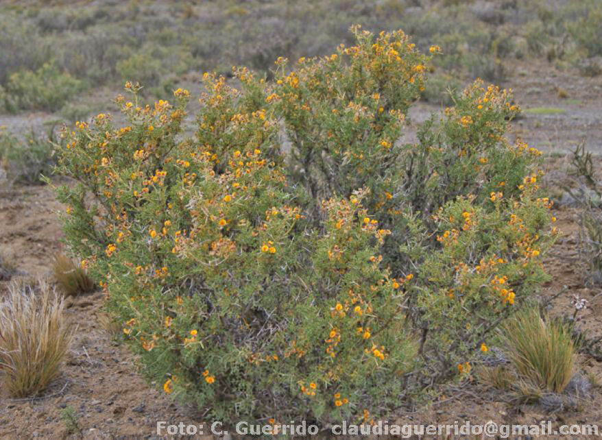 Arbusto de 15 cm a 1,5 m alt., ramoso, espinoso, subglabro y glanduloso. Indumen¬to ralo, doble: glándulas sésiles, claras, amarillentas, redondas, ± esparcidas y pelitos blanquecinos simples, aplicados, en general poco visibles. Raíz axonomorfa profunda; ramas ± flexuosas, amarillentas o castañas, leñosas en la base; espinas rígidas, simples, to¬das o en su mayoría floríferas. Hojas de aprox. 1-3 cm, caedizas, carnosas, claras, en ge neral 3-4-yugadas; pecíolos y raquis incurvos, con mucrón grueso, conspicuo, apical; es típulas de 1,5-3,5 mm, foliáceas, persistentes, ovadas a lanceoladas, glandulosas en ei borde, brevemente soldadas entre sí en la base; folíolos de 5-15 x 2,5-8 mm, opuestos, carnosos, enervios ó 1-nervios, obovados a elípticos, planos o conduplicados, glabros, a veces glandulosos o estrigosos, margen foliolar entero, dentado o aserrado, con 2-7 glán¬dulas esféricas sésiles, inmersas, o sobresalientes sobre los dientes. Flores en racimos flo¬jos apicales de raquis espinoso; brácteas de 1-4 mm, foliáceas, sésiles; pedicelos de 5-20 mm, gráciles, glabros o glanduloso-estrigosos; flores de (7) 9-15 mm; cáliz persistente, campanulado, glabro, ± glanduloso, ciliado en el borde, dientes más cortos que el tubo, subiguales, densamente pubescentes en su interior; corola anaranjada con líneas rojizas; vexilo amplio, erguido, glabro o ralamente piloso afuera, uña breve, cóncava, interior¬mente barbelada, alas obtusas, angostas, glabras; quilla ancha, aguda o subaguda, pubes¬cente en el borde inferior. Estambres libres entre sí. Ovario linear y pluriovulado con breves papilas o glándulas estipitadas; estilo recto a incurvo; estigma capitado. Lomento 2-8-articulado, falcado, anular o casi recto, con istmos anchos submarginales y cerdas subrígidas; artejos semiglobosos, glabros, abovedados, reticulado-nervosos, cubiertos de emergencias flexuosas de base rígida, glabra, cónica ± plumosa (a veces totalmente gla¬bras y con ápice glanduloso), dehiscentes sin dejar semirreplo, semillas lenticulares, gri¬sáceas o castañas.