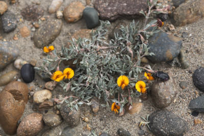 Hierba perenne de 3-10 cm alt., rizomatosa, enana, cubierta de pubescencia serícea, adpresa, de pelos bifurcados. Rizomas largos, tenues, flexuosos. Tallo ramoso, flexible, hojoso. Hojas de ± 12 mm, sésiles, generalmente 2-folioladas; folíolos de ± 8-20 mm, sé¬siles, obovados a lineares o linear-lanceolados, sumamente variables; vaina estipular 2-lo-bulada, lóbulos libres, triangulares, agudos, mucronados. Flores de 9-12 mm, solitarias, sobrepasando las hojas; cáliz con lóbulos calicinos agudos, tan o algo más largos que el tubo con algunos pelos glandulosos entre el indumento; corola amarilla con líneas viole¬ta oscuro, vexilo pubescente, a veces casi glabro, violáceo, uña generalmente barbelada; quilla glabra, dorso redondeado. Lomento pluriarticulado (6-11 artejos), flexuoso, cu¬bierto de emergencias y pubescente; los pelos bifurcados en las emergencias carnosas se cruzan a veces como floretes pero son muy diferentes a los de las emergencias plumosas.