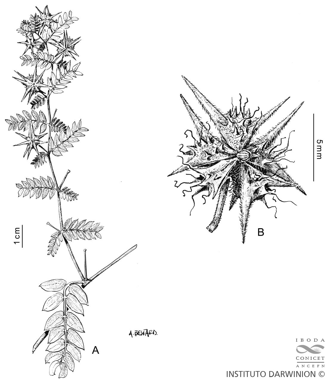Hierba anual, procumbente, ramosa; tallos cilíndricos, de 2 mm de diámetro, pubescentes, finamente surcados; entrenudos de 2-5 cm de largo. Hojas 4-7 yugas, de 3-5 × 1,5-2,5 cm, pubescentes; folíolos oblongos, de 5-13 × 2-7 mm, asimétricos, mucronulados; estípulas lanceoladas, de 1,5-2 mm de largo, pubescentes. Flores con pedúnculos de 1-1,5 cm de largo; sépalos 5, ovados, de 4 × 1,5 mm, agudos, pubescentes; pétalos obovados, de 5 × 2 mm, amarillos; estambres de 3-4 mm de largo; ovario 3-3,5 mm de largo, hirsuto-viloso. Fruto esquizocarpo de 13-15 mm de diámetro, 5 mericarpios con dos espinas grandes en su dorso en la parte superior y dos menores en la parte inferior, a veces sólo con protuberancias y muchas otras menores entre estas cuatro.