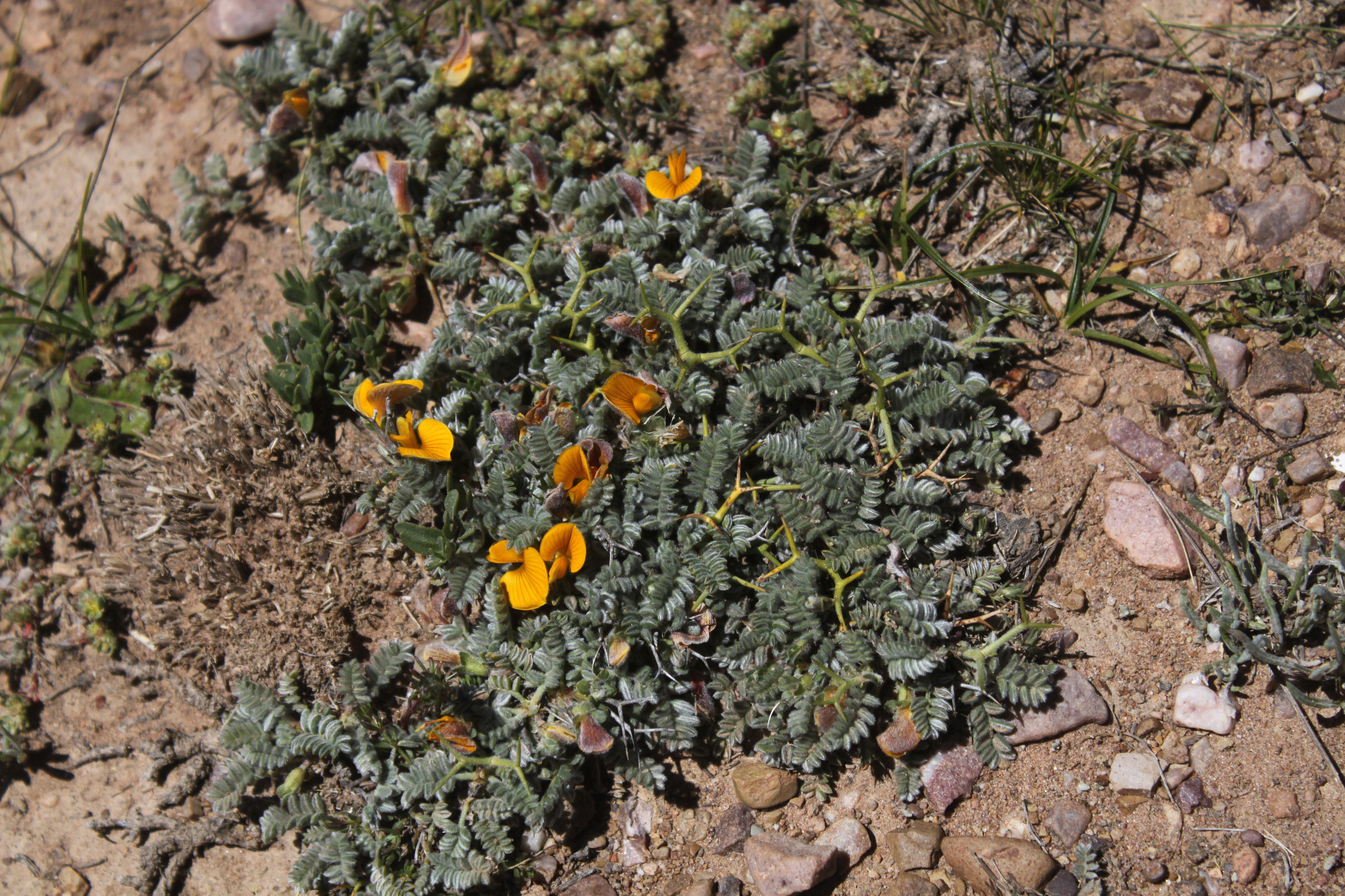Arbustos bajos, generalmente al ras del suelo, 4-10(-30) cm alt., a menudo formando cojines compactos, hasta 50 cm diám., ramas subterráneas alargadas, rara vez radicantes, comúnmente pubescentes hasta seríceas, eglandulosas; raíz axonomorfa. Espinas estériles 2-4 divididas que superan al follaje. Hojas, 0,8-1,5 cm long., seríceo-pubescentes, fasciculadas sobre braquiblastos en ramas adultas; folíolos 3-7 pares, elíptico-obovados, generalmente conduplicados, 3-7 mm long. x 1-2,5 mm lat., subagudos a obtusos, generalmente pubescentes. Flores, 1-1,2 cm long. en infloresencias umbeliformes paucifloras entre las hojas; brácteas ovadas, pequeñas, persistentes, pedicelos pubescentes, 2-7,5 mm long.; cáliz comúnmente pubescente, 5-7 mm long., lóbulos subiguales, 3-5 mm long., superando algo al tubo, subfoliáceos, ensanchados hasta 1, 9 mm lat., obtusos o mucronados; corola con el estandarte pubescente en el dorso; ovario densamente pubescente, 4-ovulado. Lomento breve, a menudo incluso en el cáliz, 1-3 articulado; artejos semicirculares, 2,5-3 mm diám, pubérulos, reticulados, generalmente con cerdas pilosas de 1-2 mm long.