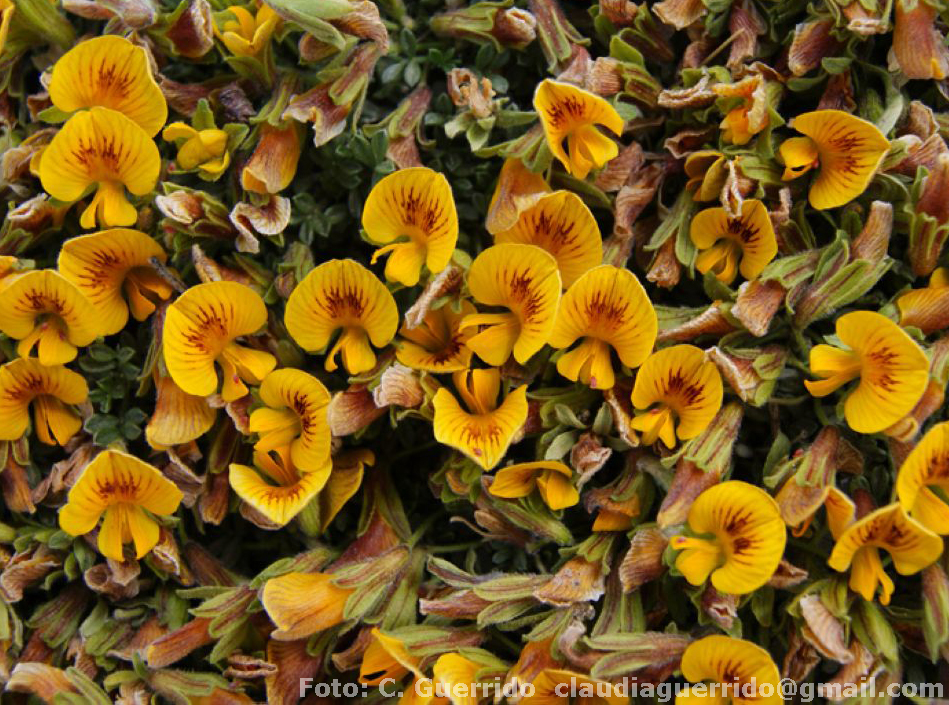 Sufrútice pulvinado, inerme, seríceo-plateado de 1-4 cm alt. y hasta 20 cm diám. Ra¬íz axonomorfa, leñosa. Hojas dísticas, pequeñas, seríceas, 2-4-folioladas; estípulas de 5 mm, anchas, hialinas, soldadas al pecíolo y parcialmente amplexicaules, 3-nervias, mar¬gen largamente pestañoso; folíolos de 2-4,2 mm, insertados en su ápice, fácilmente de-sarticulables en seco, romboides u obovado-cuneados, obtusos o subagudos, semicondu-plicados y subcarnosos, seríceos en ambas caras. Inflorescencia terminal en corimbo 1-3-^loro, sésil a subsésil, superando un poco las hojas. Flor de 6-7 mm, densamente serícea. Cáliz de 5-6 mm, dientes subiguales, subagudos, algo menores que el tubo, éste seríceo, dientes densamente albo-pilosos afuera y adentro. Corola amarilla; vexilo de 8,5 x 6-6,5 mm, lámina orbicular, subcarnosa con líneas rojas; alas de 7 mm, obtusas, uña tan larga como la lámina con un área pilosa interna arriba de la aurícula; quilla subaguda, poco más corta que el ala, densamente albo-pilosa en el dorso y borde inferior. Estambres li¬bres, brevemente incurvos. Ovario 4-5-ovulado. Lomento 1-3-articulado, con pubescen¬cia de pelitos sedosos, aplicados; artejos lenticulares, dehiscentes.