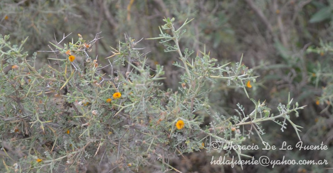 Arbustos, 0,30-2 m alt., ramas blanco-grisáceas o castañas, intricadas o no; espinas blanquecinas o rojizas, generalmente 2-9 largamente divididas. Hojas, 6-10 mm long., estípulas pequeñas, deltoides, rojizas; folíolos (2-) 3-4(-5) pares, obovados, elíptico-ovados a orbiculares, 1,5-5 mm long. x 1,5-2,5 mm lat., pilosidad variable, a veces con tricomas glandulosos hacia el margen, obtusos o emarginados. Flores, 6-7(-10) mm long., sobre braquiblastos o espinas, pedicelos pubérulos, a veces glandulosos, 3-5 mm long.; cáliz piloso o piloso y glanduloso, 3-3,5 mm long., lóbulos generalmente menores que el tubo; corola con el estandarte reflexo, glabro o piloso en el dorso. Lomento 2-5 articulado, artejos castaño-rojizos, 4-5 mm long. x 3-4 mm lat., cerdoso-piloso.