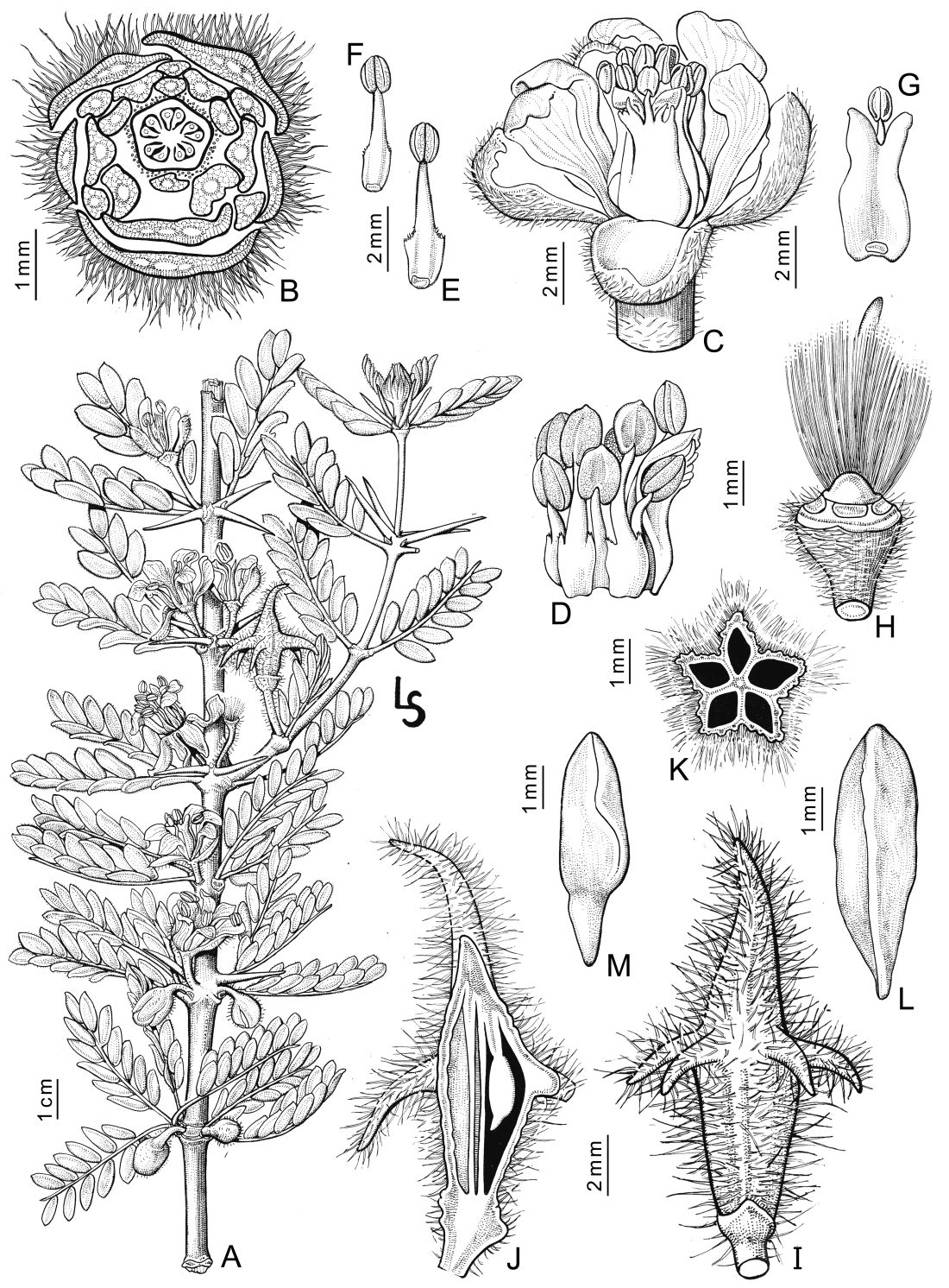 Arbusto; entrenudos de 1-3 cm de largo, con (3-)4 espinas en cada nudo de 1-2 cm de largo; estípulas lineares, de 3-4 mm de largo. Hojas 5-7-yugas, ca. 20 × 10 mm; folíolos lineares, falcados, de 1-1,5 × 4-5 mm, mucronados, densamente pubescentes; sépalos ovados, de 4-5 × 2 mm, agudos, pubescentes; pétalos obovados, de 6-7 × 1,5-2 mm, amarillentos; estambres de 5-6 mm de largo, filamentos subulados, provistos de escamas, una de ellas muy gruesa, carnosa y connada en casi toda su longitud al filamento; pistilo ca. 4 mm de largo, hirsuto-viloso, con los tricomas ocultando la espina dorsal que lleva cada carpelo. Fruto carcérulo fusiforme, ca. 12 × 10 mm, tomentoso, 5-surcado, con 5 espinas ca. 4 mm de largo, encorvadas hacia abajo.
