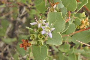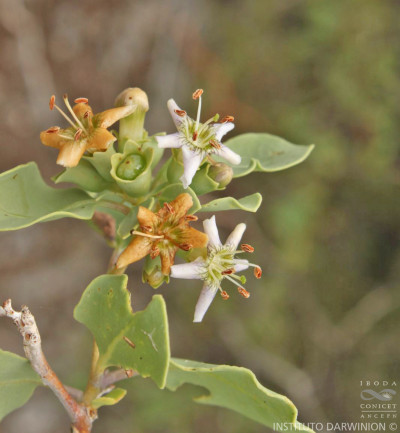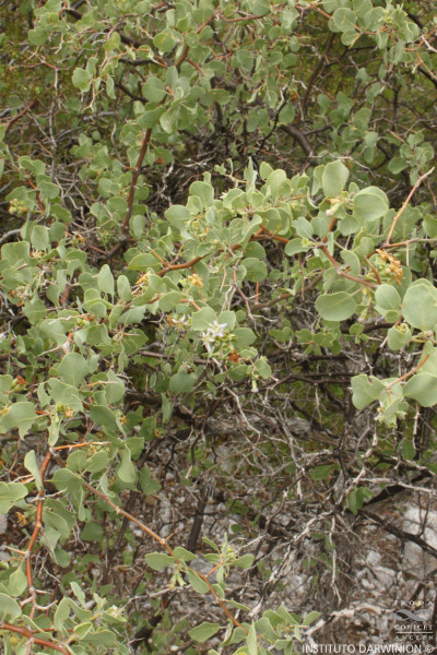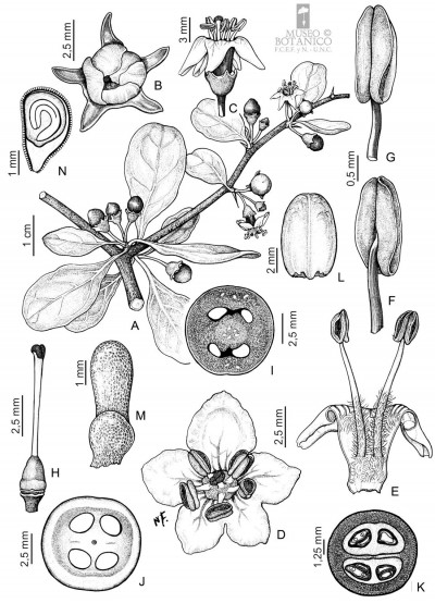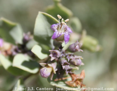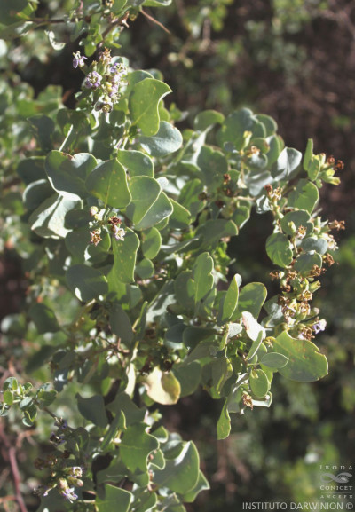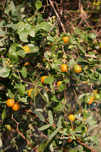 Arbustos polimorfos, erectos, de 1 a 4 m de alto, rara vez arbolitos hasta de 5 m; tallos ramificados, con espinas caulinares, lisos cuando jóvenes, brillantes, caoba-oscuros o parduzcos, luego con ritidoma agrietado. Hojas pecioladas, gruesas, planas; láminas obovado-circulares u ovadas, hasta de 45 mm de ancho, algo atenuadas en la base, a menudo redondeadas en el ápice, glaucas o verdoso-azuladas, fácilmente caducas en ejemplares de herbario, aparentemente glabras pero con tricomas glandulares, simples, brevísimos. Flores 5-meras, solitarias, 2-3 por braquiblasto, o en inflorescencias tirsoideas hasta de 12 flores, en ramas viejas o en ramitas verdosas del año, breves o largas; cáliz de 1,5-4,5(-7) mm; 5-lobado o 5-fido, más corto que el tubo corolino, tubo igual o menor que los lóbulos o divisiones, lóbulos con o sin reborde carnoso hacia el centro de la flor, poco o muy desarrollado; corola levemente zigomorfa, de (6-)8-12(-15) mm, lóbulos tan anchos como largos o algo más anchos, de base auriculada y ápice redondeado, tubo levemente subcilíndrico, generalmente entre 1,5-2,5 veces mayor que los lóbulos, blanca, violácea, blanco-verdosa, blanco-lilacina o lila-rosácea, con nervaduras atropurpúreas y manchas amarillentas o amarillo-verdosas entre las mismas; estambres exertos, subiguales, adheridos algo más arriba o más abajo del tercio basal de la corola, filamentos con tricomas en su mitad inferior; ovario 2-locular en la base y 4-locular hacia los 2/3 superiores por un falso tabique, cada uno de los 4 lóculos resultantes con 2 óvulos desiguales y alargados (uno superior grande, el otro inferior y pequeño), nectario basal amarillento, estilo largo. Nuculanio rodeado en parte o casi por completo por el cáliz no acrescente, sector carnoso externo amarillo, amarillo-anaranjado o negruzco-azulado; pirenos con el ápice redondeado y la base perforada, a menudo 3-dentada, 2-loculares en su mitad superior, cada lóculo con una semilla erecta o, a veces, con 2 semillas (una inferior pequeña que puede faltar, y otra más grande, alargada e inserta algo más arriba); semillas alargadas, muy deprimidas, ovadas a subelípticas.