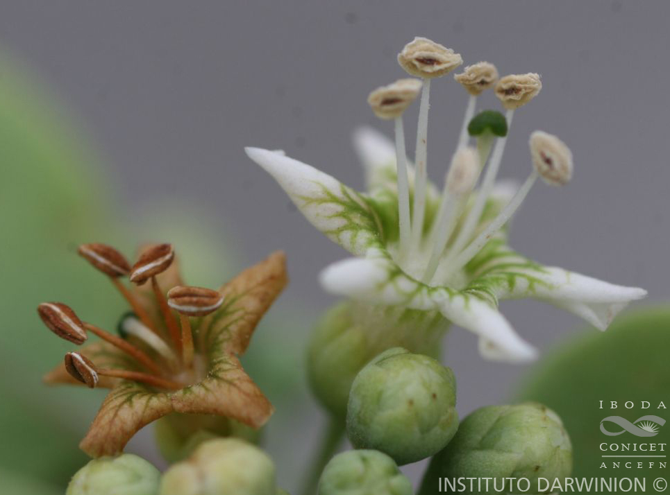 Arbustos polimorfos, erectos, de 1 a 4 m de alto, rara vez arbolitos hasta de 5 m; tallos ramificados, con espinas caulinares, lisos cuando jóvenes, brillantes, caoba-oscuros o parduzcos, luego con ritidoma agrietado. Hojas pecioladas, gruesas, planas; láminas obovado-circulares u ovadas, hasta de 45 mm de ancho, algo atenuadas en la base, a menudo redondeadas en el ápice, glaucas o verdoso-azuladas, fácilmente caducas en ejemplares de herbario, aparentemente glabras pero con tricomas glandulares, simples, brevísimos. Flores 5-meras, solitarias, 2-3 por braquiblasto, o en inflorescencias tirsoideas hasta de 12 flores, en ramas viejas o en ramitas verdosas del año, breves o largas; cáliz de 1,5-4,5(-7) mm; 5-lobado o 5-fido, más corto que el tubo corolino, tubo igual o menor que los lóbulos o divisiones, lóbulos con o sin reborde carnoso hacia el centro de la flor, poco o muy desarrollado; corola levemente zigomorfa, de (6-)8-12(-15) mm, lóbulos tan anchos como largos o algo más anchos, de base auriculada y ápice redondeado, tubo levemente subcilíndrico, generalmente entre 1,5-2,5 veces mayor que los lóbulos, blanca, violácea, blanco-verdosa, blanco-lilacina o lila-rosácea, con nervaduras atropurpúreas y manchas amarillentas o amarillo-verdosas entre las mismas; estambres exertos, subiguales, adheridos algo más arriba o más abajo del tercio basal de la corola, filamentos con tricomas en su mitad inferior; ovario 2-locular en la base y 4-locular hacia los 2/3 superiores por un falso tabique, cada uno de los 4 lóculos resultantes con 2 óvulos desiguales y alargados (uno superior grande, el otro inferior y pequeño), nectario basal amarillento, estilo largo. Nuculanio rodeado en parte o casi por completo por el cáliz no acrescente, sector carnoso externo amarillo, amarillo-anaranjado o negruzco-azulado; pirenos con el ápice redondeado y la base perforada, a menudo 3-dentada, 2-loculares en su mitad superior, cada lóculo con una semilla erecta o, a veces, con 2 semillas (una inferior pequeña que puede faltar, y otra más grande, alargada e inserta algo más arriba); semillas alargadas, muy deprimidas, ovadas a subelípticas.