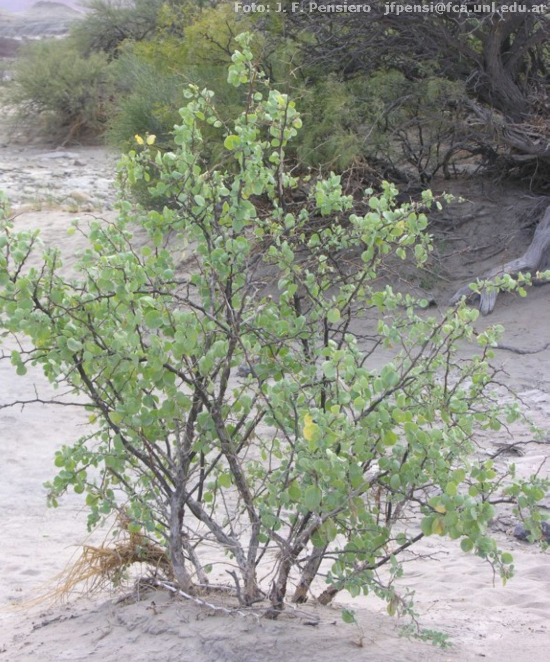 Arbustos polimorfos, erectos, de 1 a 4 m de alto, rara vez arbolitos hasta de 5 m; tallos ramificados, con espinas caulinares, lisos cuando jóvenes, brillantes, caoba-oscuros o parduzcos, luego con ritidoma agrietado. Hojas pecioladas, gruesas, planas; láminas obovado-circulares u ovadas, hasta de 45 mm de ancho, algo atenuadas en la base, a menudo redondeadas en el ápice, glaucas o verdoso-azuladas, fácilmente caducas en ejemplares de herbario, aparentemente glabras pero con tricomas glandulares, simples, brevísimos. Flores 5-meras, solitarias, 2-3 por braquiblasto, o en inflorescencias tirsoideas hasta de 12 flores, en ramas viejas o en ramitas verdosas del año, breves o largas; cáliz de 1,5-4,5(-7) mm; 5-lobado o 5-fido, más corto que el tubo corolino, tubo igual o menor que los lóbulos o divisiones, lóbulos con o sin reborde carnoso hacia el centro de la flor, poco o muy desarrollado; corola levemente zigomorfa, de (6-)8-12(-15) mm, lóbulos tan anchos como largos o algo más anchos, de base auriculada y ápice redondeado, tubo levemente subcilíndrico, generalmente entre 1,5-2,5 veces mayor que los lóbulos, blanca, violácea, blanco-verdosa, blanco-lilacina o lila-rosácea, con nervaduras atropurpúreas y manchas amarillentas o amarillo-verdosas entre las mismas; estambres exertos, subiguales, adheridos algo más arriba o más abajo del tercio basal de la corola, filamentos con tricomas en su mitad inferior; ovario 2-locular en la base y 4-locular hacia los 2/3 superiores por un falso tabique, cada uno de los 4 lóculos resultantes con 2 óvulos desiguales y alargados (uno superior grande, el otro inferior y pequeño), nectario basal amarillento, estilo largo. Nuculanio rodeado en parte o casi por completo por el cáliz no acrescente, sector carnoso externo amarillo, amarillo-anaranjado o negruzco-azulado; pirenos con el ápice redondeado y la base perforada, a menudo 3-dentada, 2-loculares en su mitad superior, cada lóculo con una semilla erecta o, a veces, con 2 semillas (una inferior pequeña que puede faltar, y otra más grande, alargada e inserta algo más arriba); semillas alargadas, muy deprimidas, ovadas a subelípticas.