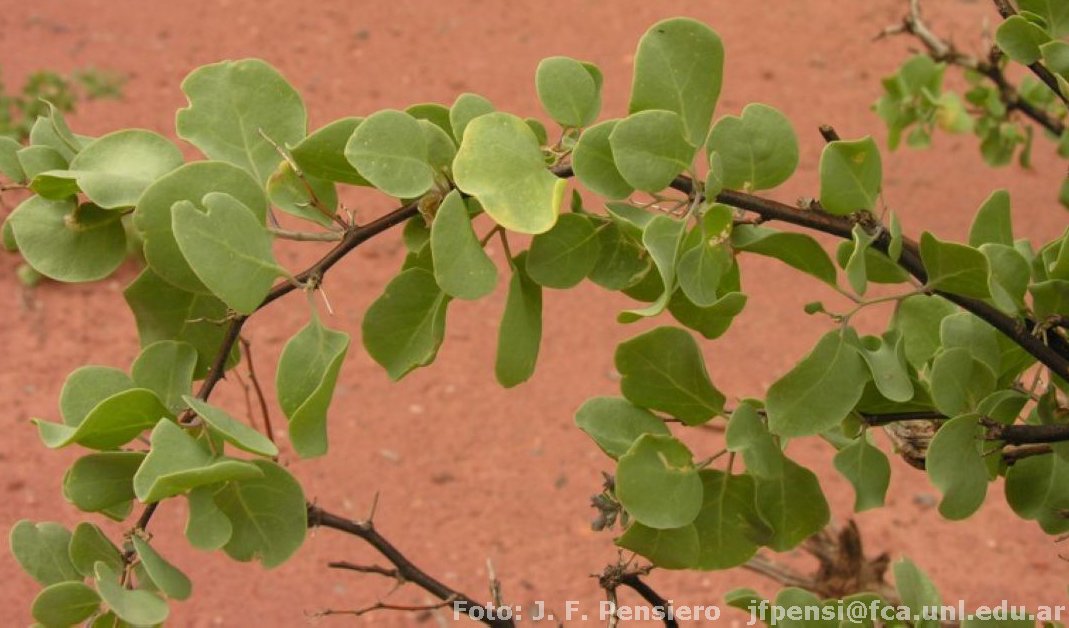 Arbustos polimorfos, erectos, de 1 a 4 m de alto, rara vez arbolitos hasta de 5 m; tallos ramificados, con espinas caulinares, lisos cuando jóvenes, brillantes, caoba-oscuros o parduzcos, luego con ritidoma agrietado. Hojas pecioladas, gruesas, planas; láminas obovado-circulares u ovadas, hasta de 45 mm de ancho, algo atenuadas en la base, a menudo redondeadas en el ápice, glaucas o verdoso-azuladas, fácilmente caducas en ejemplares de herbario, aparentemente glabras pero con tricomas glandulares, simples, brevísimos. Flores 5-meras, solitarias, 2-3 por braquiblasto, o en inflorescencias tirsoideas hasta de 12 flores, en ramas viejas o en ramitas verdosas del año, breves o largas; cáliz de 1,5-4,5(-7) mm; 5-lobado o 5-fido, más corto que el tubo corolino, tubo igual o menor que los lóbulos o divisiones, lóbulos con o sin reborde carnoso hacia el centro de la flor, poco o muy desarrollado; corola levemente zigomorfa, de (6-)8-12(-15) mm, lóbulos tan anchos como largos o algo más anchos, de base auriculada y ápice redondeado, tubo levemente subcilíndrico, generalmente entre 1,5-2,5 veces mayor que los lóbulos, blanca, violácea, blanco-verdosa, blanco-lilacina o lila-rosácea, con nervaduras atropurpúreas y manchas amarillentas o amarillo-verdosas entre las mismas; estambres exertos, subiguales, adheridos algo más arriba o más abajo del tercio basal de la corola, filamentos con tricomas en su mitad inferior; ovario 2-locular en la base y 4-locular hacia los 2/3 superiores por un falso tabique, cada uno de los 4 lóculos resultantes con 2 óvulos desiguales y alargados (uno superior grande, el otro inferior y pequeño), nectario basal amarillento, estilo largo. Nuculanio rodeado en parte o casi por completo por el cáliz no acrescente, sector carnoso externo amarillo, amarillo-anaranjado o negruzco-azulado; pirenos con el ápice redondeado y la base perforada, a menudo 3-dentada, 2-loculares en su mitad superior, cada lóculo con una semilla erecta o, a veces, con 2 semillas (una inferior pequeña que puede faltar, y otra más grande, alargada e inserta algo más arriba); semillas alargadas, muy deprimidas, ovadas a subelípticas.