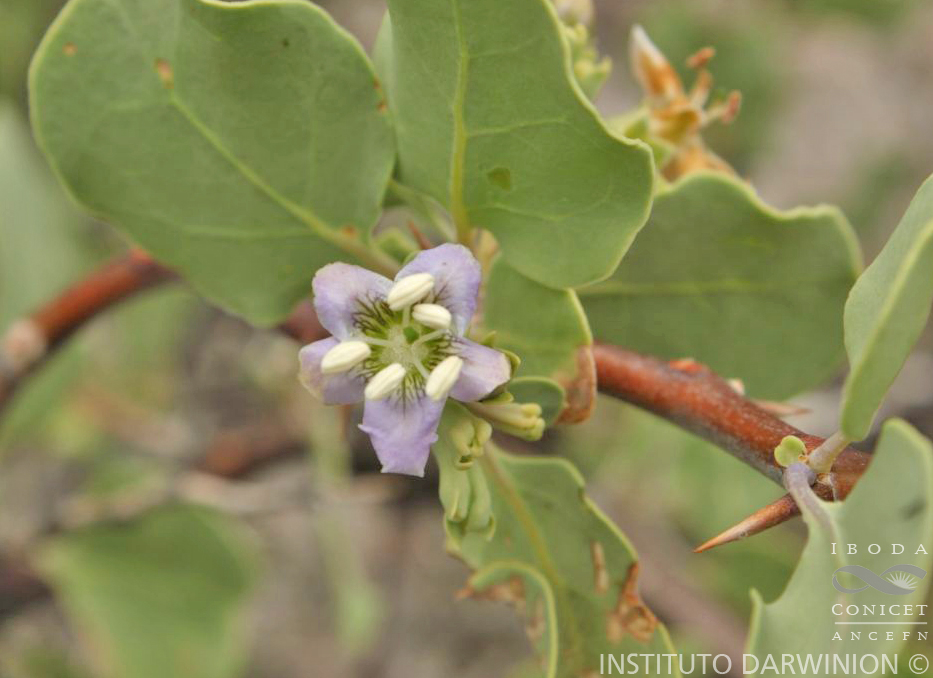 Arbustos polimorfos, erectos, de 1 a 4 m de alto, rara vez arbolitos hasta de 5 m; tallos ramificados, con espinas caulinares, lisos cuando jóvenes, brillantes, caoba-oscuros o parduzcos, luego con ritidoma agrietado. Hojas pecioladas, gruesas, planas; láminas obovado-circulares u ovadas, hasta de 45 mm de ancho, algo atenuadas en la base, a menudo redondeadas en el ápice, glaucas o verdoso-azuladas, fácilmente caducas en ejemplares de herbario, aparentemente glabras pero con tricomas glandulares, simples, brevísimos. Flores 5-meras, solitarias, 2-3 por braquiblasto, o en inflorescencias tirsoideas hasta de 12 flores, en ramas viejas o en ramitas verdosas del año, breves o largas; cáliz de 1,5-4,5(-7) mm; 5-lobado o 5-fido, más corto que el tubo corolino, tubo igual o menor que los lóbulos o divisiones, lóbulos con o sin reborde carnoso hacia el centro de la flor, poco o muy desarrollado; corola levemente zigomorfa, de (6-)8-12(-15) mm, lóbulos tan anchos como largos o algo más anchos, de base auriculada y ápice redondeado, tubo levemente subcilíndrico, generalmente entre 1,5-2,5 veces mayor que los lóbulos, blanca, violácea, blanco-verdosa, blanco-lilacina o lila-rosácea, con nervaduras atropurpúreas y manchas amarillentas o amarillo-verdosas entre las mismas; estambres exertos, subiguales, adheridos algo más arriba o más abajo del tercio basal de la corola, filamentos con tricomas en su mitad inferior; ovario 2-locular en la base y 4-locular hacia los 2/3 superiores por un falso tabique, cada uno de los 4 lóculos resultantes con 2 óvulos desiguales y alargados (uno superior grande, el otro inferior y pequeño), nectario basal amarillento, estilo largo. Nuculanio rodeado en parte o casi por completo por el cáliz no acrescente, sector carnoso externo amarillo, amarillo-anaranjado o negruzco-azulado; pirenos con el ápice redondeado y la base perforada, a menudo 3-dentada, 2-loculares en su mitad superior, cada lóculo con una semilla erecta o, a veces, con 2 semillas (una inferior pequeña que puede faltar, y otra más grande, alargada e inserta algo más arriba); semillas alargadas, muy deprimidas, ovadas a subelípticas.