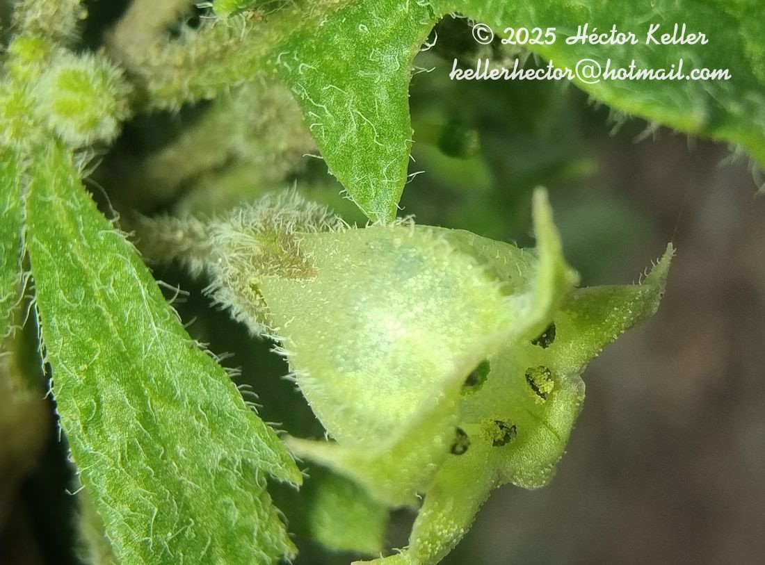 Hierbas anuales o bienales; tallos decumbentes, pubescentes, ca. 40 cm. Hojas subsésiles o con pecíolos cortos, de 2-2,5 cm, excepto las basales con pecíolos más largos; láminas pinnatífidas a pinnatisectas, de 3-7 × 1,5-3,7 cm, base decurrente, pubescentes en ambas superficies, cada pinna desigualmente 3-fida, mucronada. Flores (2-)4-6 por nudo; pedicelos erectos hasta de 2 cm, cáliz de 2,5-3,5 mm, con abundantes tricomas eglandulares y glandulares, segmentos pinnatidentados a pinnatipartidos; corola blanquecina a verdoso-amarillenta, de 8-11 mm, por fuera con igual indumento que el cáliz, tubo urceolado, muy pubescente por fuera y con bandas de tricomas en la zona de soldadura de los filamentos por dentro, lóbulos patentes o reflexos, anchamente ovados acuminados, interiormente con abundantes tricomas glandulares (cabezuela 1-celular); filamentos adheridos en la mitad superior del tubo, anteras apenas exertas, de 1,2-1,5 mm; gineceo largo hasta casi el borde superior del tubo corolino, estigma subesférico, verdoso. Baya verdosa con pintas violáceas o violácea, globosa, de 1-1,5 cm de diámetro, colgante; cáliz fructífero con los lóbulos o sólo las lacinias reflexas; semillas subesféricas o subreniformes, casi negras, episperma muy foveolado, de (3-)3,5-4,5(-4,8) × 3-3,5 mm.