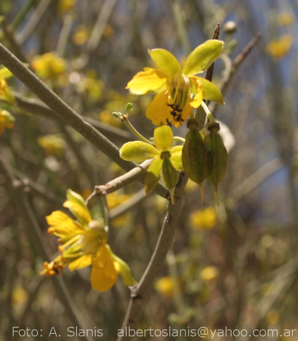 Arbusto retamoide, de 1,5-3 m de alto o árbol hasta ca. 6 m de alto; ramas y tallos jóvenes con pubescencia adpresa, que luego es reemplazada por una abundante cubierta cerosa blanquecina, frágil cuando seca; entrenudos de 2-9 cm de largo. Hojas de 1-4 × 0,6-2,5 cm, caducas; folíolos (2-)4-6(-8), angostamente elípticos a oblongos, de 4-17 × 2,8-7,3 mm, asimétricos, alternos o subopuestos, raramente opuestos, con 1-2(-3) nervios principales, mucronulados, ralamente pubescentes en la cara abaxial, con tricomas hasta de 0,5 mm de largo. Flores solitarias, raramente en monocasios; pedúnculos pubescentes, de 7-15 mm de largo; sépalos obovados, de 5-10 × 3-6 mm, ralamente pubescentes; pétalos obovados, de 5-10 × 3,5-6 mm, unguiculados; estambres de 7-10 mm de largo; escamas laciniadas, de 1,9-4 mm de largo, las del ciclo externo algo mayores y con los apéndices recurvados; anteras de 1,6-3,9 mm de largo; pistilo de 6-10 mm de largo; ovario elipsoide, 5-carpelar, 5-locular, glabro, con 10-12 óvulos por carpelo; ginóforo breve. Fruto elipsoide, de 17-30 × 13-25 mm, glabro. Semilla oblongo-reniforme, de 5-11 × 1,6-3,4 mm, albuminada.
