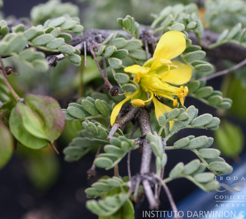 Arbusto o subarbusto, de 0,50-1,50 m de alto; ramas rígidas, pubescentes. Hojas de 1-5 × 0,5 cm; folíolos 6-18, oblongo-elípticos, de 4-14 × 1-5 mm, los apicales menores que los basales, asimétricos, mucronados o no, alternos o subopuestos, 1-3 nervadas, con tricomas hirsutos en ambas caras; pulvínulos muy desarrollados, por lo que el folíolo aparece con un breve peciólulo; estípulas oval-agudas, de 2-3 mm de largo, rojizas, caducas. Flores solitarias, axilares; pedúnculos de 0,7-1,7 cm de largo; sépalos de 5-7 × 3-6 mm, desiguales, con pocos tricomas pétalos de 7-13 mm de largo, amarillos; estambres de 7-11 mm de largo; escamas del ciclo interno algo menores y sólo con el ápice laciniado; estambres con filamento de 6-9 mm de largo, anteras 1,2-2,1 mm de largo; escamas ca. 4,6 mm de largo, cada una de las escamas del ciclo externo al principio aparecen connadas por sus bordes formando un pequeño tubo, que más tarde se dividen en dos o más partes, formándose así un segmento interno y otro externo; ovario fusiforme, de 4 mm de largo, 5-carpelar, 5-locular, glabro, con 3-6 óvulos por lóculo; estilo subulado, de 4 mm de largo. Fruto de contorno oblongo, de 8-15 × 9-16 mm, 5-alado glabro. Semilla oblongo-reniforme, de 4,5-7 × 1,4-2,5 mm, con endosperma.