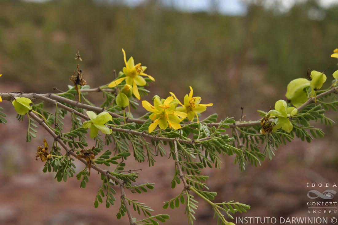 Arbusto o subarbusto, de 0,50-1,50 m de alto; ramas rígidas, pubescentes. Hojas de 1-5 × 0,5 cm; folíolos 6-18, oblongo-elípticos, de 4-14 × 1-5 mm, los apicales menores que los basales, asimétricos, mucronados o no, alternos o subopuestos, 1-3 nervadas, con tricomas hirsutos en ambas caras; pulvínulos muy desarrollados, por lo que el folíolo aparece con un breve peciólulo; estípulas oval-agudas, de 2-3 mm de largo, rojizas, caducas. Flores solitarias, axilares; pedúnculos de 0,7-1,7 cm de largo; sépalos de 5-7 × 3-6 mm, desiguales, con pocos tricomas pétalos de 7-13 mm de largo, amarillos; estambres de 7-11 mm de largo; escamas del ciclo interno algo menores y sólo con el ápice laciniado; estambres con filamento de 6-9 mm de largo, anteras 1,2-2,1 mm de largo; escamas ca. 4,6 mm de largo, cada una de las escamas del ciclo externo al principio aparecen connadas por sus bordes formando un pequeño tubo, que más tarde se dividen en dos o más partes, formándose así un segmento interno y otro externo; ovario fusiforme, de 4 mm de largo, 5-carpelar, 5-locular, glabro, con 3-6 óvulos por lóculo; estilo subulado, de 4 mm de largo. Fruto de contorno oblongo, de 8-15 × 9-16 mm, 5-alado glabro. Semilla oblongo-reniforme, de 4,5-7 × 1,4-2,5 mm, con endosperma.