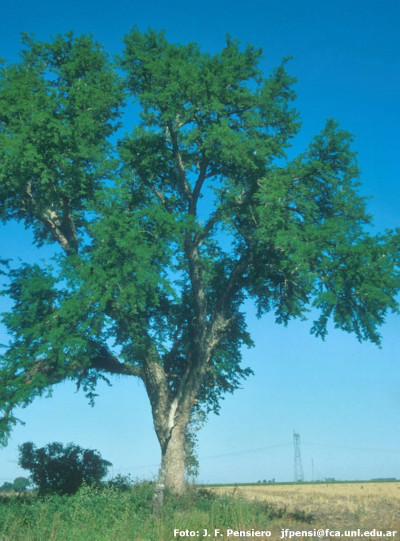 Arboles caducifolios 5-20 m alt., tronco de corteza suberosa pardo-rojiza, en placas rectangulares. Espinas axilares de 5-15 mm, geminadas y divaricadas en las ramas annótinas. Estípulas caducas, con tricomas glandulares en la axila y margen. Hojas 2-4 yugadas, con una glándula pateliforme sobre el pecíolo y otra entre el par terminal de pinas; pecíolo y raquis 1º de 20 - 83 mm long., con pubescencia no adpresa en el haz; pinas 5-12 yugadas 30-80 mm long.; folíolos opuestos a subopuestos 3-20 mm long. x 1-6 mm lat., oblongos a cultriformes, de ápice agudo y base truncada, pubescentes en el margen. Capítulos axilares en las ramas del año, solitarios, geminados o en breves racimos; pedúnculo 0,8-3,2 cm long.; brácteas caducas,lineales. Flores blancas o ebúrneas, fragantes. Cáliz 1,3–3,8 mm long., poculiforme, dientes pubérulos. Corola 3,5-8 mm long., infundibuliforme, lóbulos recurvados poco pubescentes en el envés. Androceo 9,2–12.5 mm long., 20 estambres, filamentos blancos, anteras amarillas, tubo exerto. Ovario oblongo, angosto, estipitado, disco nectarífero prominente. Legumbre 2,6-8 cm long. x 1-1,8 cm lat., espiralada (circinada), con 2-6 espiras más o menos laxas, tardíamente dehiscente, pluriseminada, de mesocarpio negro y carnoso, endocarpio crustáceo a leñoso, pardo-rojizo o amarillo ocráceo. 2n= 26