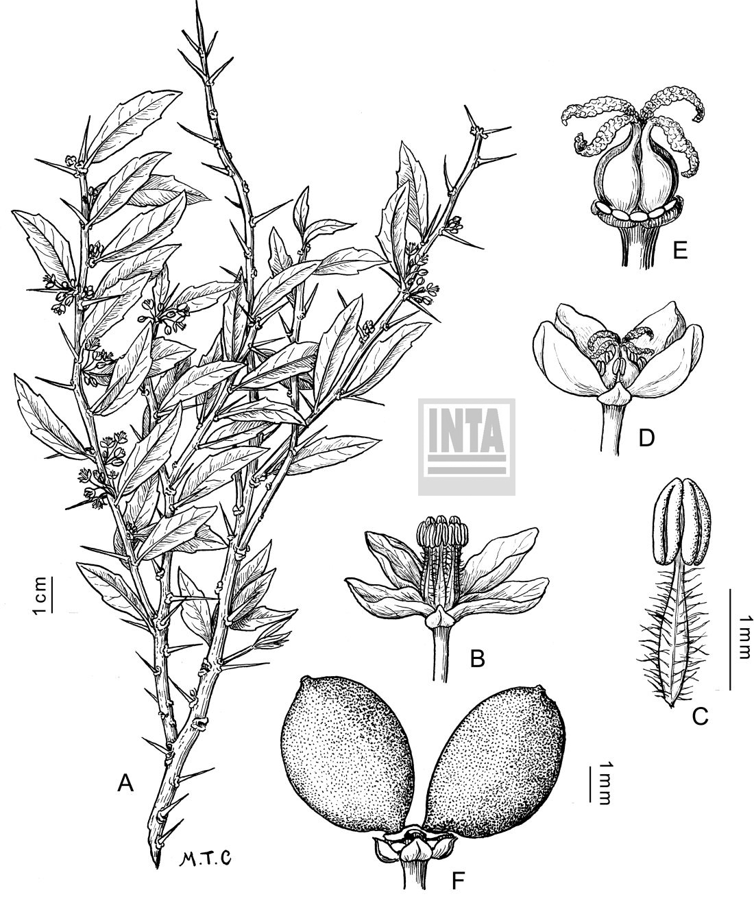 Arbustos de 1-3 m de alto; corteza longitudinalmente estriada, cinérea, con espinas de 0,4-2,5(-3) cm de largo, axilares, rígidas, lisas. Hojas con pecíolo semicilíndrico, de 2-5 mm de largo, caniculado, pubérulo; láminas oblongas a elípticas, de (2-)-2,5-5(-8) × 1-2,5(-3) cm, base atenuada, ápice obtuso a retuso, mucronulado, margen entero, un poco revoluto, 3-5-dentado en la mitad apical, glabras hasta esparcidamente pubescentes en la cara adaxial, densamente pubescentes en la cara abaxial, nervadura media prominente en la cara abaxial, con 8-12(-14) pares de nervios secundarios salientes en la cara abaxial, cartáceas a subcoriáceas. Inflorescencias en fascículos de 6-10 flores, axilares; brácteas triangulares, pubérulas. Flores con sépalos triangulares, subcarnosos, exteriormente pubérulos; pétalos ovales, de 2-3,5 mm de largo, obtusos, cóncavos, glabros o exteriormente pilosos a lo largo de la nervadura media, verdosos a rosados, membranáceos. Flores estaminadas con pedicelos de 2-3 mm de largo; estambres más pequeños que los pétalos, con filamentos subulados cubiertos de tricomas largos, anteras de 1,5 mm de largo; disco glabro y pistilodio rudimentario piloso (a veces ausente). Flores pistiladas con pedicelos de 1-2 mm de largo, diminutamente pubérulos; gineceo 4-carpelar, estilos apenas unidos, estigmas largos, divergentes. Fruto agregado con carpidios drupáceos, elipsoideo-comprimidos, de (0,8-)1 × 0,7(-0,9) cm, cortamente apiculados, castaño rojizos. Semilla envuelta por el endocarpo coriáceo.