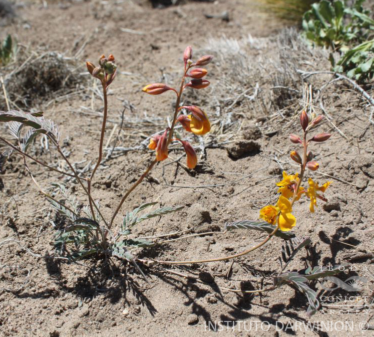 Hierba de 4-20 cm alt., acaule o caulescente, pubescente o glabra, con o sin pelos glandulosos. Estípulas de 2-4 x 2-3 mm, anchamente ovado-deltoides, agudas o subagu-das, pubescentes, ciliadas, rojizas. Hojas 1-yugadas, pinnas 6-15-(18-)yugadas; folíolos se¬cundarios de 2-10 x 1,5-4 mm, ovado o elípticos a subfalcados, obtusos o levemente agu¬dos, pubescentes a glabros, generalmente nerviados. Racimos de 5-20 cm, 8-10-floros. Flores de ± 10 mm. Cáliz de 7-9 mm. Corola con pétalos de 8-11 x 5-6 mm. Ovario pu¬bescente o glabro, con (10) 13-16 (19) óvulos. Legumbre de 2,5-3 cm x 5-6 mm, recur¬vada hasta en semicírculo o con torsiones, glabra o pubescente. Semillas 10 ó más, de 3x2 mm, castañas.