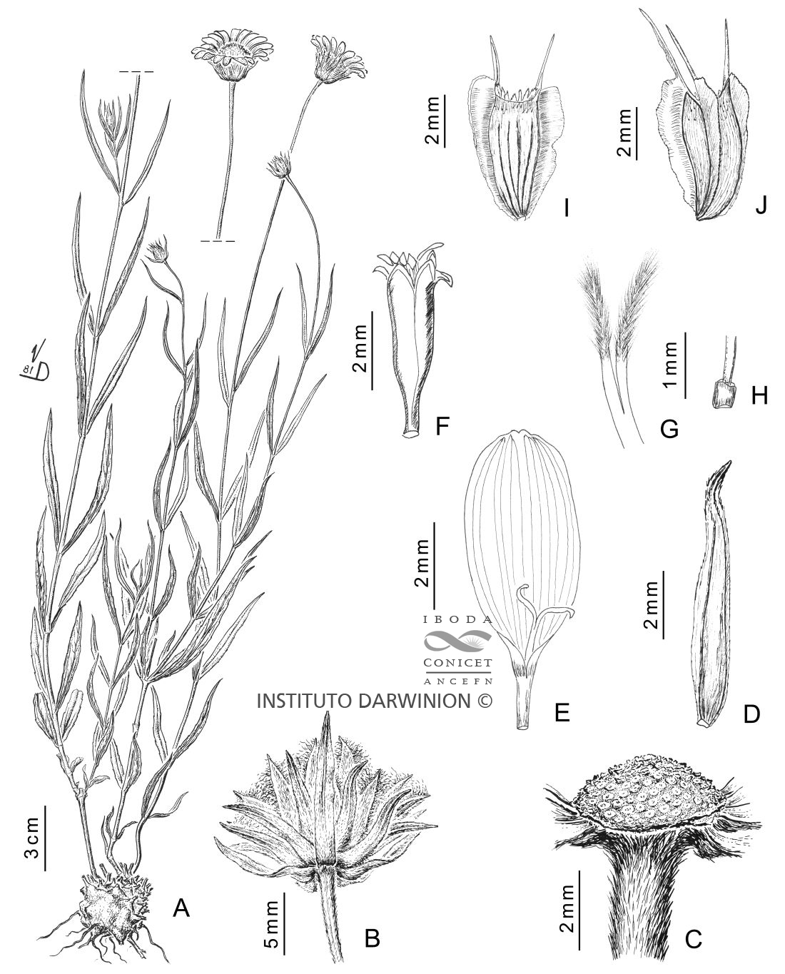 A. Planta. B. Capítulo. C. Receptáculo. D. Pálea. E. Flor del margen (ovario no dibujado). F. Flor del centro (ovario no dibujado). G. Parte superior del estilo. H. Base del estilo. I, J. Aquenios con el papus.