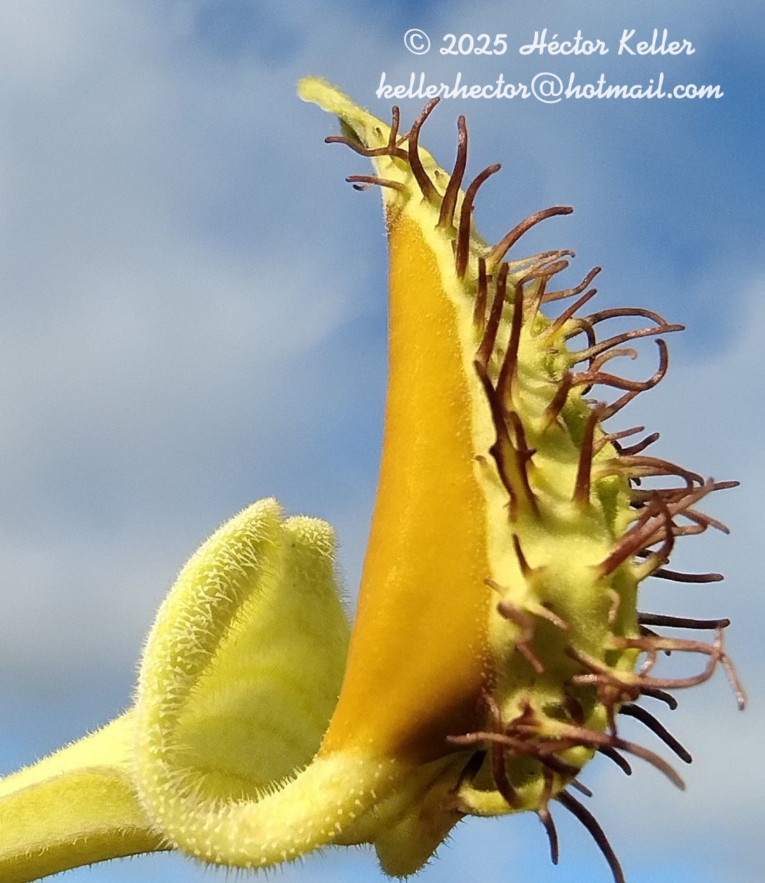 Hierbas perennes, densamente hirsuto-pubérulas; pseudoestípulas ausentes. Hojas con pecíolos de 3-8 mm de largo, sin zona de abscisión basal, hirsuto-pubérulos; láminas angostamente ovadas, a veces angostamente oblongas, de 5-10 × 1,5-3 cm, base cordado-lobada, escotaduras de 3-6 mm de profundidad, ápice obtuso a redondeado, haz hirsuto-pubérula a glabrescente, envés densamente pubérulo, venas primarias basales 5, casi lisas por el envés, venas de orden mayor lisas por la haz, poco manifiestas por el envés. Flores axilares, solitarias, ebracteoladas; pedúnculo floral más ovario de 1,5-2,5 cm de largo, hirsuto-pubérulos, sin zona basal de abscisión. Perianto hirsuto por fuera, levemente curvado; utrículo obovoide, de 8-12 × 2,2- 2,5 mm, base con una constricción de menos de 1 mm; tubo infundibuliforme, de 2-4,4 cm de largo, ca. 1 mm de diámetro en la región proximal, ca. 4 mm de diámetro en la región distal, en línea recta con respecto al utrículo; limbo ovado, fuertemente constricto en la base, de 3-4 × 1-2 cm, formando un ángulo de 160-180º con el tubo, usualmente con 2 hileras de fimbrias simples hasta de 4 mm de largo, a lo largo de las zonas marginal y submarginal de la superficie adaxial. Cápsulas cilíndricas, de 2,8-3,4 × 1-1,5 cm, hirsutas, rostradas, rostro de 3 mm de largo. Semillas ovoides, ca. 5 × 4 mm, cóncavo-convexas, verrugosas, la rafe prominente.