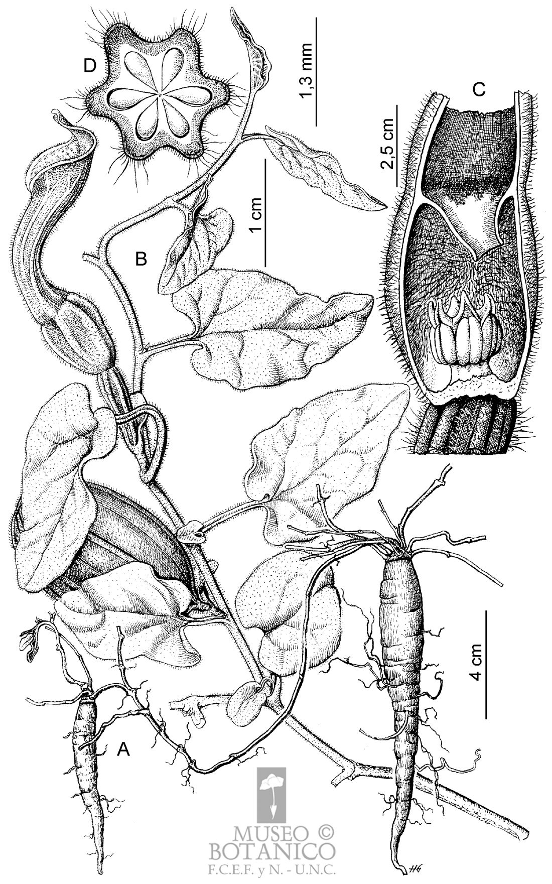 Hierbas postradas, pubérulas; pseudoestípulas ausentes; tallos y hojas densamente hirsutas. Hojas con pecíolos de 0,4-1 cm de largo, sin zona de abscisión basal, pubérulos; láminas ovadas a angostamente ovadas, de 1-3(-3,5) × 0,7-1,5(-2) cm, cartáceas y estrigosas, base truncada o levemente cordada, simétrica, escotaduras de 1-2 mm de profundidad, ápice obtuso, haz esparcidamente pubérula, envés pubérulo, margen levemente undulado, venas primarias basales 3(-5), poco manifiestas en el envés, venación de orden superior laxamente reticulada e inconspicua. Inflorescencias parciales en ripidios bracteolados de 1(-2) flores; bractéola sésil, ovada, de 3-5 × 2-3 mm, no perfoliada; pedúnculo floral más ovario de 4-5 mm de largo, densamente pubérulo. Perianto densamente pubérulo exteriormente, fuertemente reflexo; utrículo elipsoide, hasta de 6 × 3 mm; tubo hasta de 7 mm de largo, curvado en ángulo agudo con el utrículo; limbo ovado, de 1-1,5 × 0,5 cm, en línea recta con el tubo. Cápsulas subglobosas, de 1,5-2 × 0,8-1,2 cm, con pocas (ca. 10) semillas por carpelo, pubérulas, glabrescentes al abrir, dehiscencia basípeta, no rostradas. Semillas ovoides, de 4-5 × 4- 5 mm, cóncavo-convexas, verrugosas, no aladas, la rafe promínula con extensiones membranáceas casi tan grandes como la semilla.