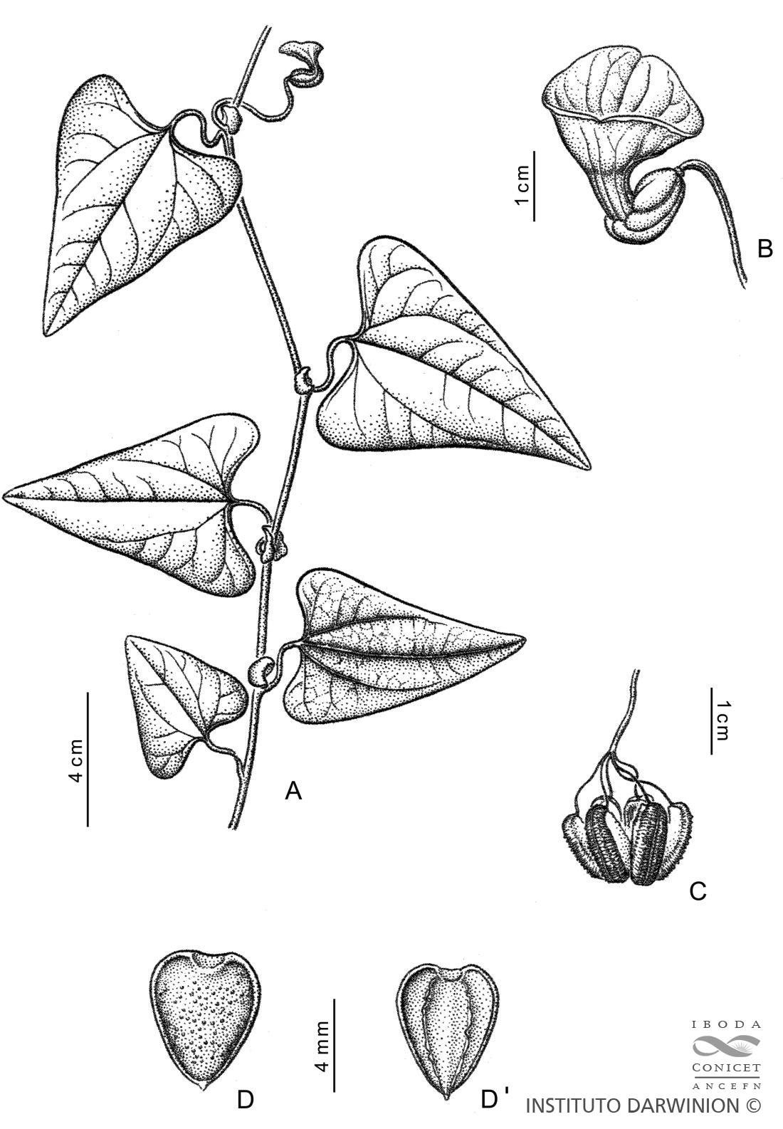 A. Rama florífera. B. Flor. C. Fruto. D-D’. Semilla, vistas ventral y dorsal, respectivamente. Tomado de Fl. Paraguay 41: 54, fig. 19. 2010.