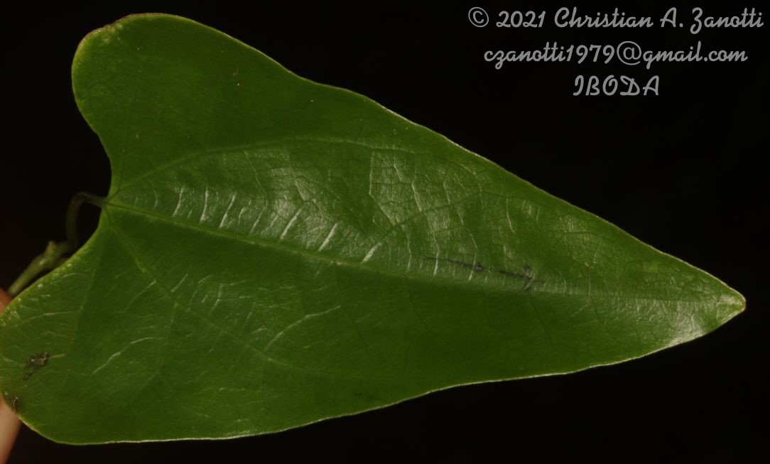 Lianas con tallos suberosos hasta de 4 cm de diámetro; pseudoestípulas presentes, hasta de 2 cm de diámetro. Hojas con pecíolos de (1,5)-3-7 cm de largo, glabros; láminas ovadotriangulares, de 6-12(-17) × 5-8(-14) cm, enteras, base truncada o muy levemente cordada, escotaduras hasta de 5(-18) mm de profundidad, ápice agudo a veces obtuso, haz glabra, envés glabrescente o cortamente pubérulo, no micropunteado, venas primarias basales 5, venación de orden superior poco manifiestas en el envés. Flores axilares, solitarias, usualmente en ramas reducidas; pedúnculo más ovario de 2-3 cm de largo. Perianto glabro exteriormente; utrículo oblongo a obovoide, de 8-12 × 3-4 mm, base redondeada, no apendiculada; tubo infundibuliforme, de 1 cm de largo × ca. 2,5 mm de diámetro en la región proximal, 5-6 mm de diámetro en la región distal, en ángulo recto con el utrículo, limbo 1- labiado, anchamente ovado, de 1-1,5 × 1-2 cm, en ángulo de 150- 180º con el tubo, base no constricta, ápice obtuso a redondeado. Cápsulas anchamente cilíndricas, de 1,5-2,5 × ca. 1 cm, verrugosas y con estrías transversales y venas de los carpelos crestadas. Semillas anchamente ovoides, de 4-5 × 3,5-4,5 mm, aplanadas, más o menos lisas, no aladas, con una extensión membranácea adaxial a lo largo de la rafe prominente.