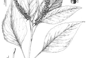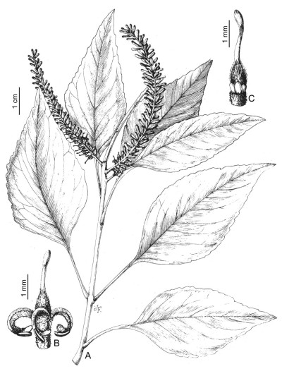Árboles de 12-15 m de alto, ramas jóvenes pubescentes, rápidamente glabrescentes. Hojas simples con pecíolos de 1,5-4 cm de largo; láminas angostamente ovadas, de 5,5-9 × 2-4,3 cm, base decurrente, ápice agudo, margen groseramente serrado, dientes incurvos más o menos marcados, pubescentes al menos en la base de la vena media, cartáceas. Racimos de 5,2-6,5 × 1,3 cm, densamente ferruginoso-pubescentes. Flores con perigonio de 4-4,5 mm de largo, blanquecino; ovario pubescente. Fruto folículos de 2,6-3 × 1,8-1,9 cm, constrictos en la base en 1-2 mm de largo, pedicelos de 1-2 mm de largo, ferruginoso-pubescentes a glabrescentes.