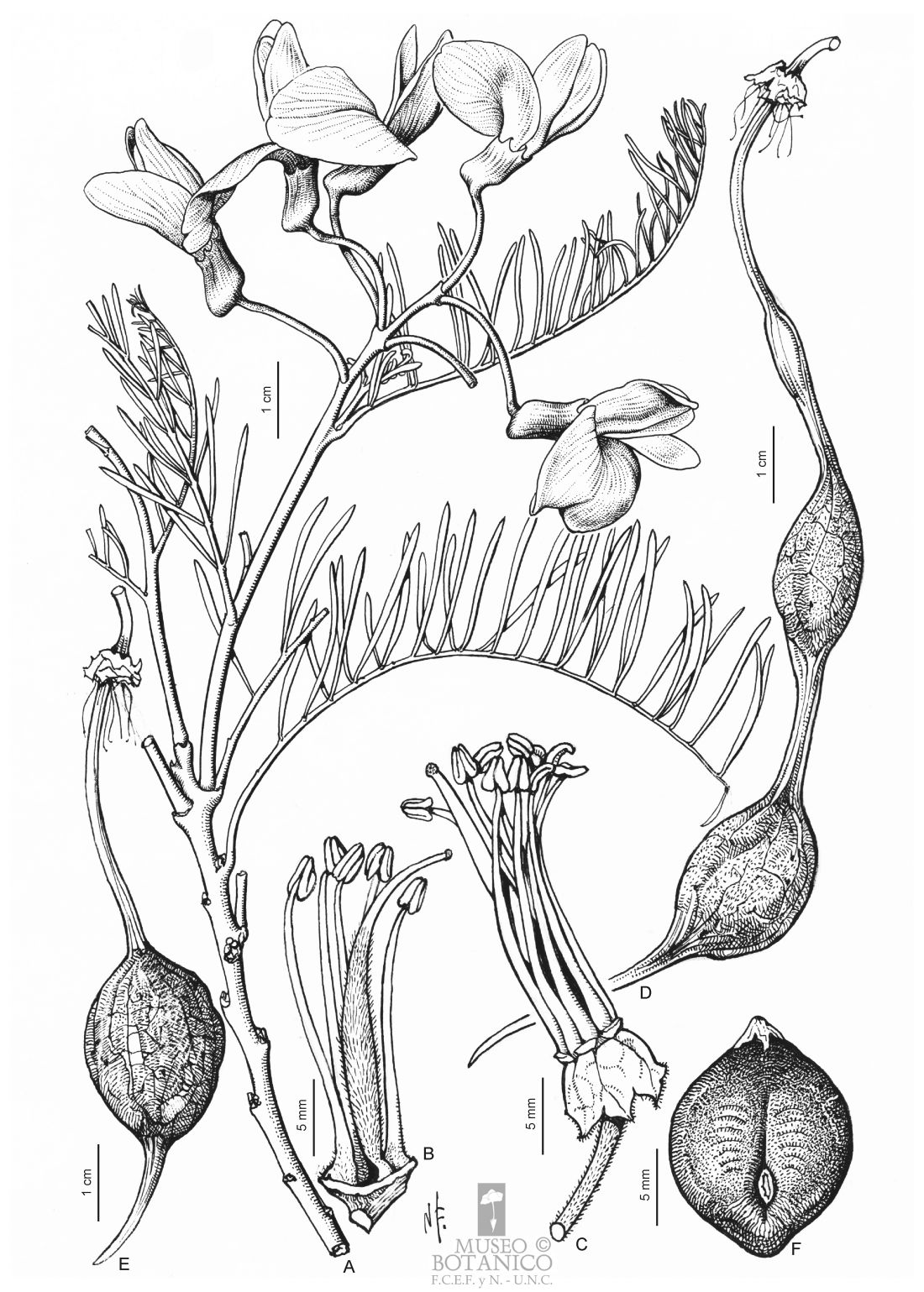 Sufrútices de 0,40-1,50 m de alt., rizomatosos. Hojas seríceo-plateadas, de 5-9 cm; folíolos (10) 15-16 (23) subpareados. Racimos terminales, de 3-4 cm, paucifloros; pedicelos de 8- 12 mm. Legumbre grisácea, largamente estipitada, de 6-12 × 1-1,3 cm, con apículo de 2-7 mm, papirácea, subdehiscente.