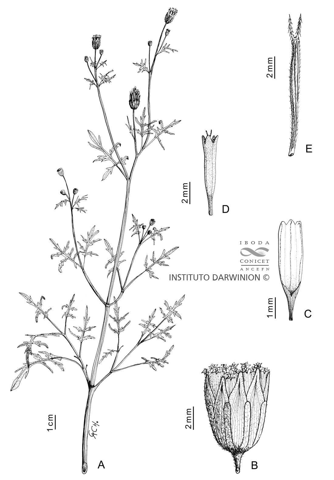 Hierbas anuales, erectas, de 10-40 cm de alto, con tallos delgados, ramosos, costados, estriados, casi glabros, laxamente hojosos. Hojas opuestas, pecioladas, de contorno ovado, de 3-5 cm de largo, profundamente bipinnatisectas, con segmentos oblongos a lanceolados o lineares, agudos, glabros. Capítulos pocos, subdiscoides, solitarios en los extremos de las ramitas o formando cimas muy laxas; pedúnculos de 2-6 cm de largo, delgados, glabros. Involucro cilíndrico o angostamente acampanado, de 3-4 × 4-5 mm durante la floración, acrescente a la fructificación alcanzando hasta unos 7 mm de largo; filarios pocos, 2-seriados, glabros, los externos estrechamente lineares, agudos, a veces con algunas cilias en el margen, los internos lanceolados, membranáceos y de bordes hialinos. Flores del margen pocas (o ausentes), neutras, con lígula elíptica, ca. 2 mm de largo, amarilla; flores del centro pocas, perfectas, con corolas tubulosas, amarillas, 5-dentadas. Aquenios fusiformes, de 8-14 mm de largo, costados, estriados, por lo general pubescentes, de color oscuro. Papus formado por 2-3 aristas cortas con pelos retrorsos.