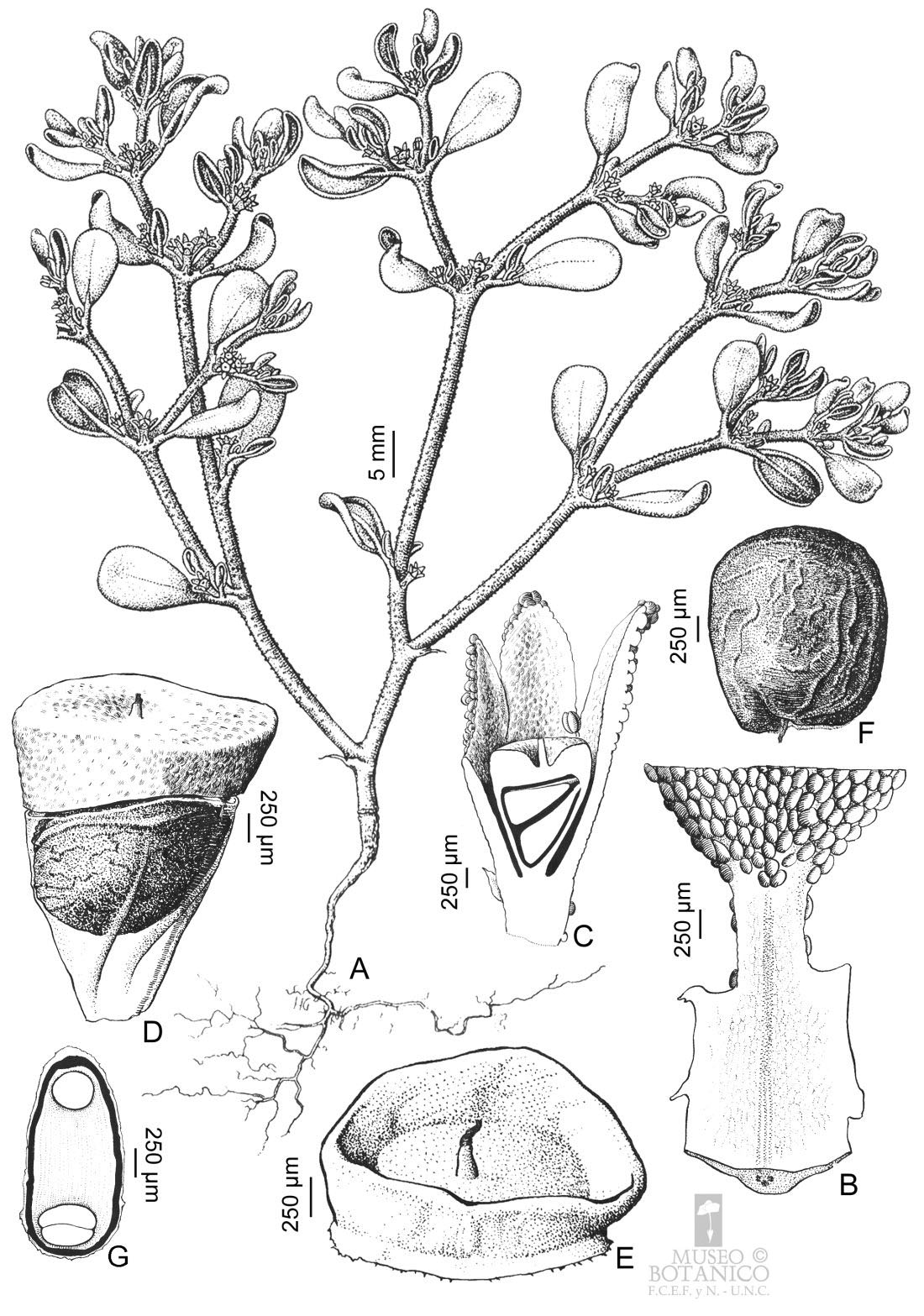 Hierbas anuales, de 8-20 cm de alto, cubiertas por papilas globosas u ovoides; tallos ramificados; ramas decumbentes a oblicuas, hasta de 30-40 cm de largo. Hojas en pares opuestos, usualmente desiguales; pseudoestípulas rectangulares, terminadas en un diente corto; láminas obovadas a obovado-espatuladas, de 10-13 × 6-8,5 mm, papilosas; margen entero; base cuneada; ápice usualmente redondeado. Flores agrupadas en cimas densas; la bráctea y bractéolas angostamente acuminadas; cáliz con 5 sépalos papilosos, con un mucrón erecto en el ápice; estambre 1, ocasionalmente 2-3; estilo corto. Frutos pixidios obcónicos, rodeadas por el cáliz persistente, ca. 3 mm de largo, con un opérculo truncado que desarrolla un margen alado periférico. Semillas 1-2, negras; la superior horizontal y ovoide, la inferior oblicua, generalmente más plana.