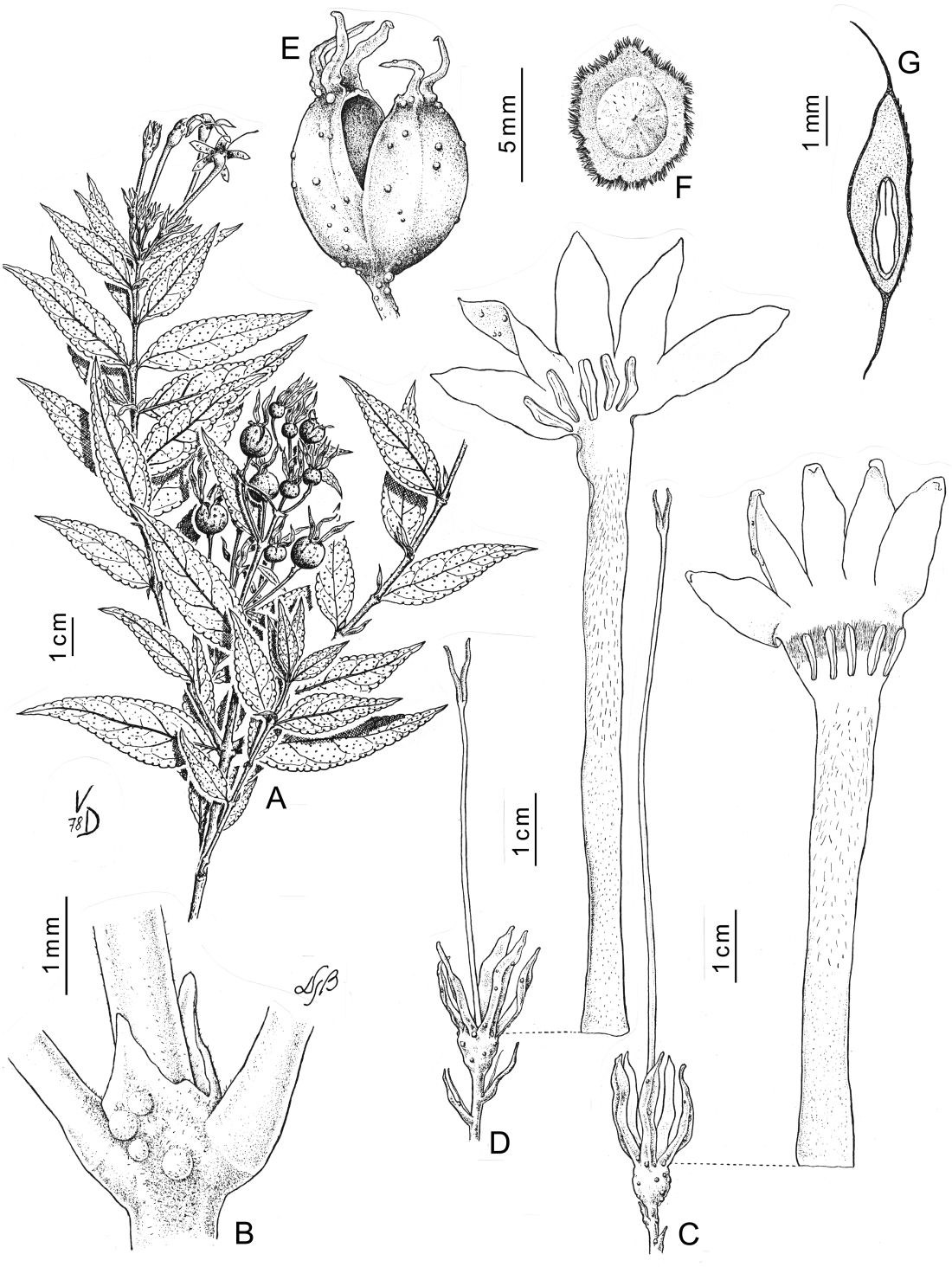 A. Rama con flores y frutos. B. Estípula. C. Flor longistila: hipanto, estilo, estigma, corola desplegada y androceo. D. Flor brevistila: hipanto con bractéolas basales, estilo, estigma, corola desplegada y androceo. Fruto dehiscente. F-G. Semilla, cara hilar y corte longitudinal, respectivamente.