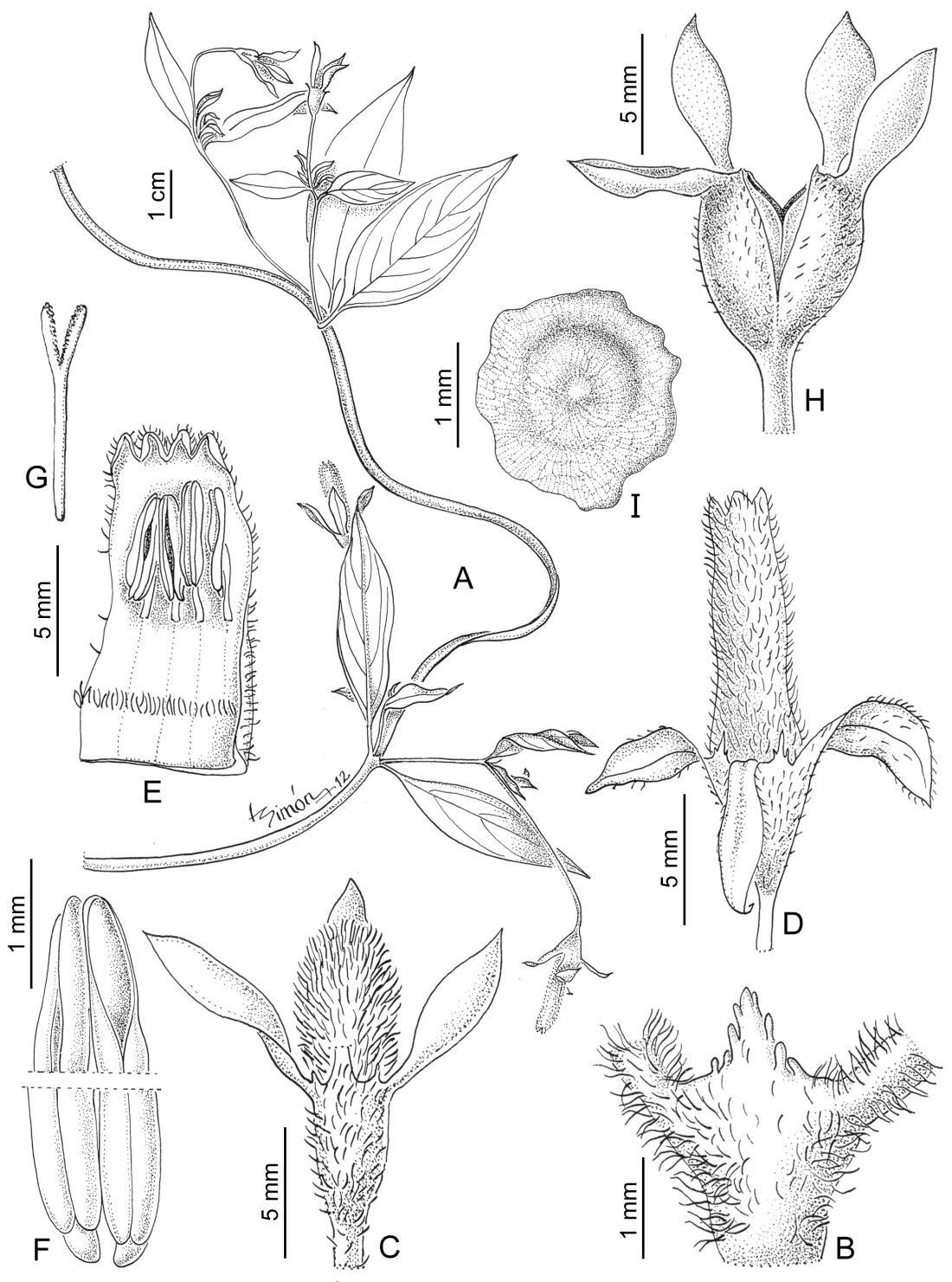 A. Porción de una rama con flores y frutos. B. Estípula. C. Botón floral. D. Flor en antesis. E. Corola desplegada y estambres. F. Detalle del ápice y base de anteras, con conectivo extendido basalmente. G. Estilo. Fruto dehiscente. I. Semilla, cara hilar.