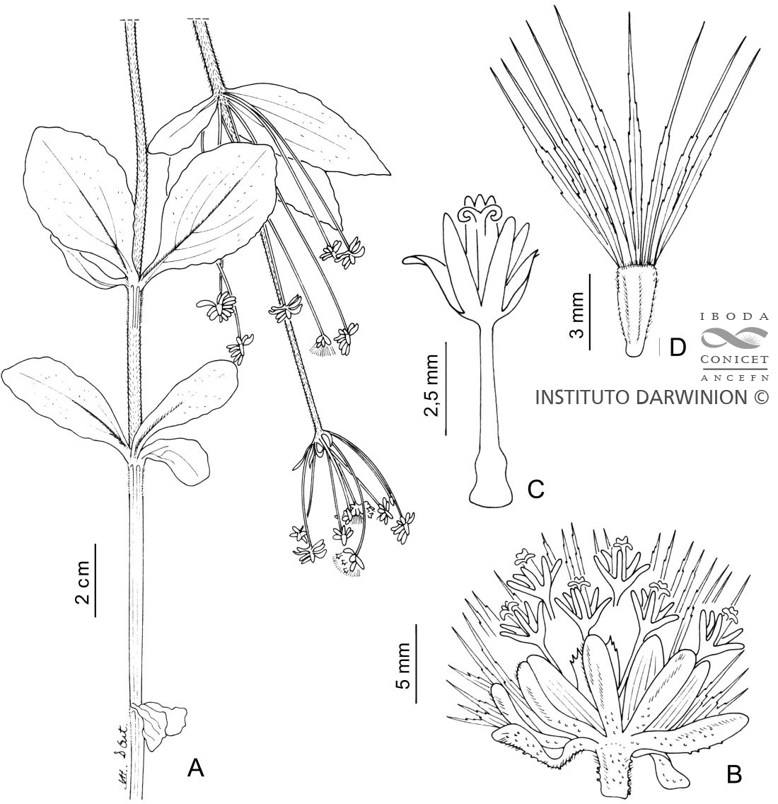 A. Rama florífera. B. Capítulo. C. Flor (ovario y papus no dibujados). D. Aquenio y papus.