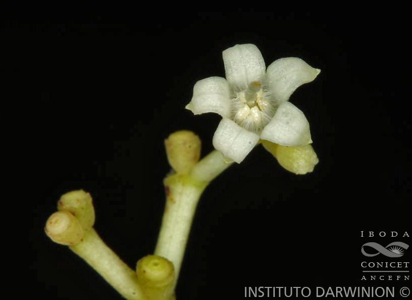 Observaciones: Nombres vulgares. “Chalchal de gallina”, “jazmín de la costa o del monte”. Observaciones.- Florece y fructifica casi todo el año. Es una especie polimorfa en el tamaño de las hojas, longitud y densidad de la inflorescencia, forma y tamaño del fruto y de las flores, y número de lóbulos del cáliz. Sin embargo, entre las numerosas especies del género, puede ser fácilmente reconocida por las estípulas generalmente ovadas, tempranamente caducas, y domacios en forma de bolsillo alargado, especialmente evidentes al final de la vena media.