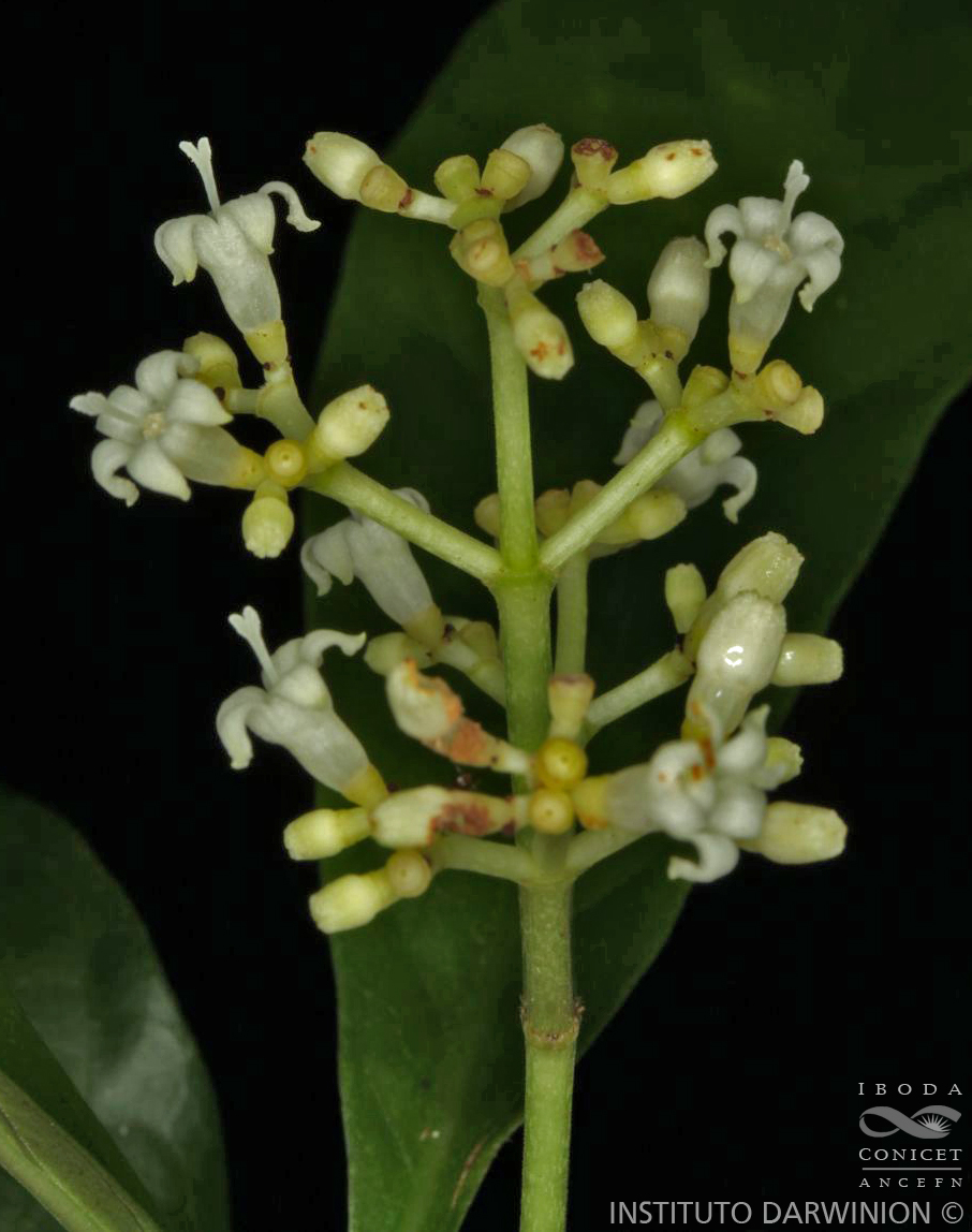 Observaciones: Nombres vulgares. “Chalchal de gallina”, “jazmín de la costa o del monte”. Observaciones.- Florece y fructifica casi todo el año. Es una especie polimorfa en el tamaño de las hojas, longitud y densidad de la inflorescencia, forma y tamaño del fruto y de las flores, y número de lóbulos del cáliz. Sin embargo, entre las numerosas especies del género, puede ser fácilmente reconocida por las estípulas generalmente ovadas, tempranamente caducas, y domacios en forma de bolsillo alargado, especialmente evidentes al final de la vena media.