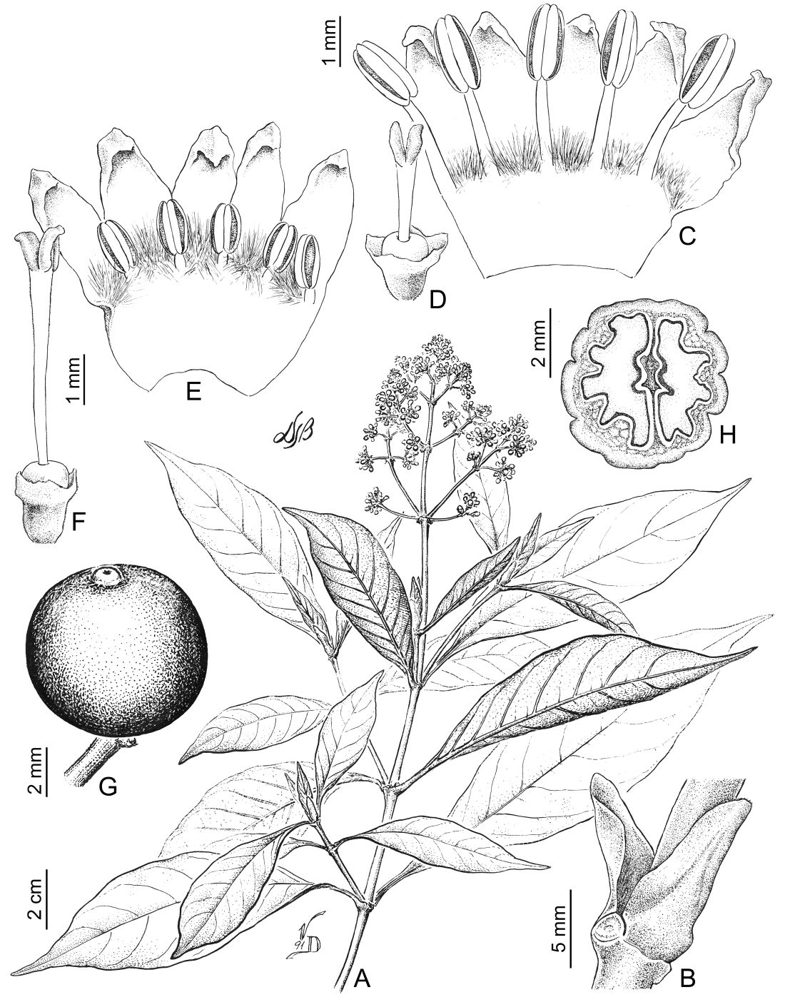 A. Rama florífera. B. Estípula. C-D. Flor brevistila: C, corola desplegada y androceo; D, hipanto, estilo y estigma. E-F. Flor longistila: E, corola desplegada y androceo; F, hipanto, estilo y estigma. G-H. Fruto, vista lateral y corte transversal, respectivamente.