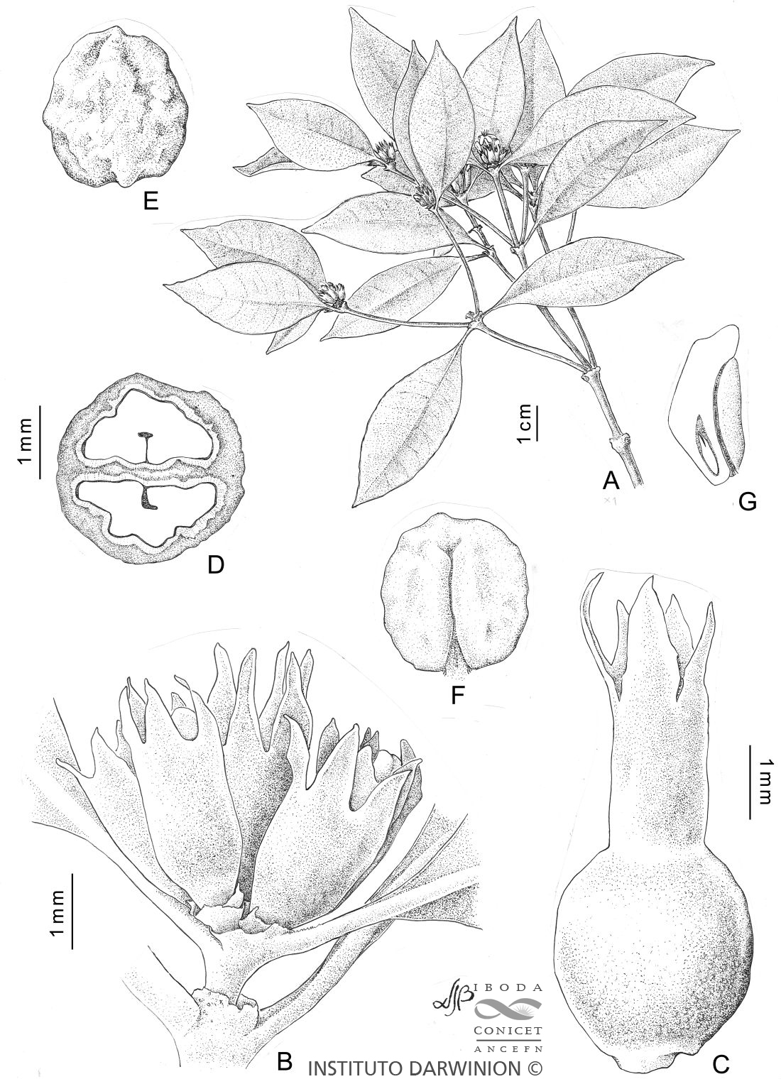 Arbusto o arbolito de 2-3(-5) m de alto. Hojas con láminas elípticas u elíptico-oblongas, de 30-120 × 10-35 mm, discoloras, glabras, ápice acuminado, base cuneada, con 7-12 nervios secundarios; estípulas interpeciolares de 0,5-1,5 mm de largo, con borde truncado, rasgándose en 2 lóbulos triangulares con fimbria linear, caduca, coléteres en la cara interna. Inflorescencias en cimas contraídas, 1-8-floras, fasciculadas, no ramificadas, terminales, sésiles o subsésiles; brácteas elíptico-lanceoladas o triangulares, de 1-3 mm de largo, agudas o acuminadas. Flores sésiles, rodeadas de bractéolas triangulares, pequeñas; hipanto cupuliforme, de 1,5-3 mm de largo, glabro; cáliz 4-5 lobado, lóbulos elíptico-lanceolados o triangulares, a veces algo irregulares, tubo de 2-6 mm de largo, cartáceo; corola infundibuliforme, de 5-10 mm de largo, blanca, externamente glabra e internamente con un anillo pubescente en la mitad superior del tubo; estambres 5, insertos en la garganta del tubo; estilo 2-fido, de 5-10 mm de largo. Fruto una drupa globosa, de 5-7 × 4-5,5 mm, azulada a azulado rojiza, con cáliz persistente verde claro; pirenos con la cara ventral surcada, cara dorsal convexa y suavemente costada.