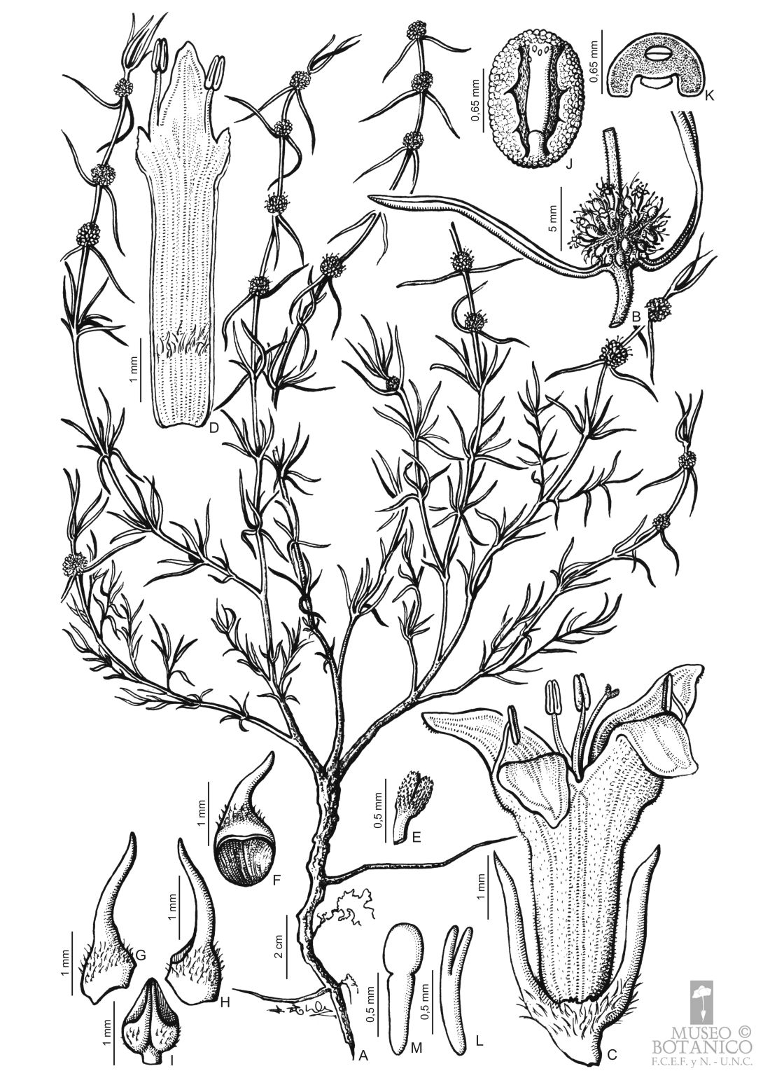 A. Planta. B. Sector de tallo con inflorescencia y hojas. C. Flor. D. Sector de corola desplegada. E. Estigma. F. Sector apical del fruto visto de frente. G-I. Fruto dehiscente, se observan sus 3 partes: 1 basal y 2 apicales. J. Semilla. K. Transcorte por semilla. L-M. Embrión.