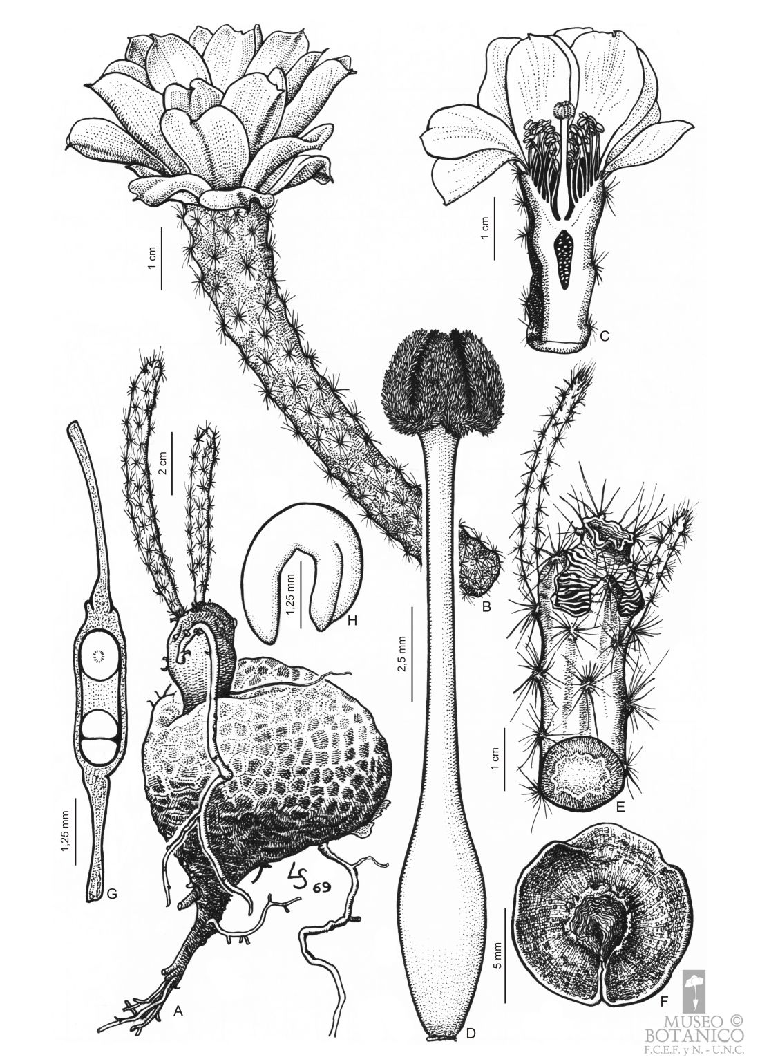 A. Planta con 2 flores jóvenes. B. Flor, vista lateral. C. Corte longitudinal por flor. D. Gineceo. E. Fruto maduro con la tapita aún adherida. F. Semilla. G. Transcorte de semilla. H. Embrión.
