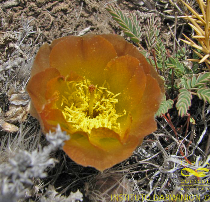 Plantas cespitosas, con pocas ramas, las que se forman por las superposición de unos pocos artejos de 1 - 1,5 cm diám. y poco más long. (hasta 8 cm según la descripción original, pero esto es seguramente un error o una deformación de cultivo), obpiriformes, verde-castaños a rojizos. Espinas centrales 1 - 2, de ca. 2 cm, desarrollándose solo en los ápices, erectas, aplanadas, rígidas o poco flexibles, blancuzcas hasta castañas o negruzcas. Espinas radiales 10 - 15, de 3 - 4 mm, blancas. Gloquidios pocos e inconspicuos. Flores de 2 - 3 cm diám., amarillas hasta rosadas o castaño rojizas. Receptáculo con aréolas similares a las de los tallos, con las espinas más desarrolladas. Borde de receptáculo con el perigonio con escamas que llevan pequeñas espinas axilares. Frutos con las aréolas caedizas al madurar; semillas de ca. 3 mm diám. lenticulares, cubiertas por el arilo de 4 - 6 mm diám., rugoso, discoide, con ala pequeña.
