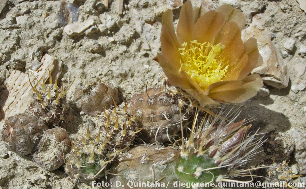 Plantas cespitosas, con pocas ramas, las que se forman por las superposición de unos pocos artejos de 1 - 1,5 cm diám. y poco más long. (hasta 8 cm según la descripción original, pero esto es seguramente un error o una deformación de cultivo), obpiriformes, verde-castaños a rojizos. Espinas centrales 1 - 2, de ca. 2 cm, desarrollándose solo en los ápices, erectas, aplanadas, rígidas o poco flexibles, blancuzcas hasta castañas o negruzcas. Espinas radiales 10 - 15, de 3 - 4 mm, blancas. Gloquidios pocos e inconspicuos. Flores de 2 - 3 cm diám., amarillas hasta rosadas o castaño rojizas. Receptáculo con aréolas similares a las de los tallos, con las espinas más desarrolladas. Borde de receptáculo con el perigonio con escamas que llevan pequeñas espinas axilares. Frutos con las aréolas caedizas al madurar; semillas de ca. 3 mm diám. lenticulares, cubiertas por el arilo de 4 - 6 mm diám., rugoso, discoide, con ala pequeña.
