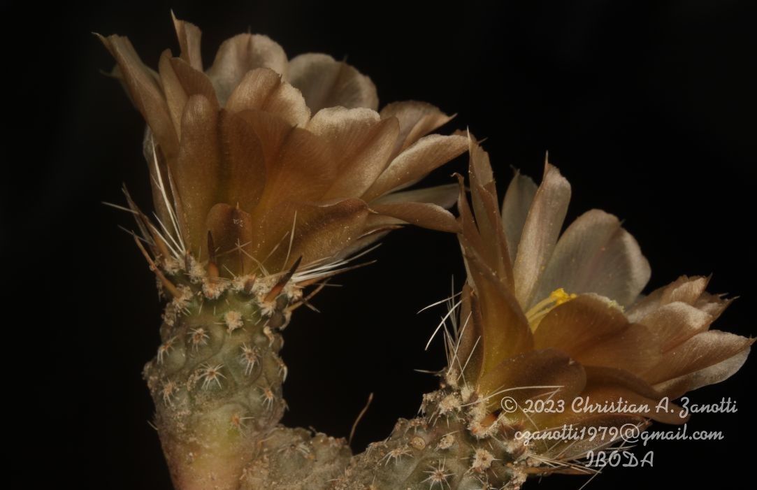 Plantas cespitosas, con pocas ramas, las que se forman por las superposición de unos pocos artejos de 1 - 1,5 cm diám. y poco más long. (hasta 8 cm según la descripción original, pero esto es seguramente un error o una deformación de cultivo), obpiriformes, verde-castaños a rojizos. Espinas centrales 1 - 2, de ca. 2 cm, desarrollándose solo en los ápices, erectas, aplanadas, rígidas o poco flexibles, blancuzcas hasta castañas o negruzcas. Espinas radiales 10 - 15, de 3 - 4 mm, blancas. Gloquidios pocos e inconspicuos. Flores de 2 - 3 cm diám., amarillas hasta rosadas o castaño rojizas. Receptáculo con aréolas similares a las de los tallos, con las espinas más desarrolladas. Borde de receptáculo con el perigonio con escamas que llevan pequeñas espinas axilares. Frutos con las aréolas caedizas al madurar; semillas de ca. 3 mm diám. lenticulares, cubiertas por el arilo de 4 - 6 mm diám., rugoso, discoide, con ala pequeña.