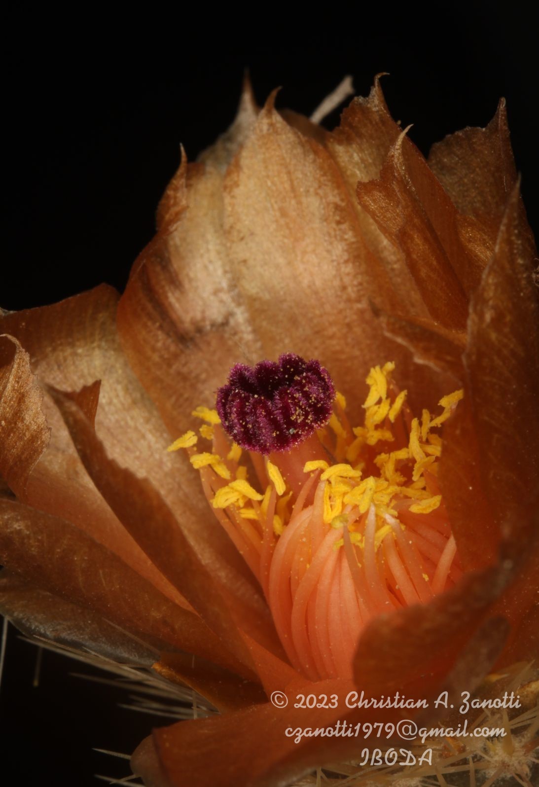 Raíces alargadas, compuestas por varios segmentos. Artejos de 2 - 3 (5) x 1 cm diám., globosos a cilindroides, cortos, completamente cubiertos por las espinas. Espinas muy numerosas, ca. 20, de 1 - 2 cm, aciculares, rectas, más o menos rígidas, amarillentas con base castaña hasta completamente negras; gloquidios numerosos. Flores separadas de los tallos por un leve estrechamiento en la base del ovario, de ca. de 3 cm long. y diám., con las aréolas del receptáculo espinosas, similares a las de los tallos. Segmentos del perigonio de ca. 2 x 1 cm, anchos, mucronados. Estambres de 0,5 - 1 cm, numerosos; anteras estrechas, terminando en una punta aguda. Estilo de 2 cm, cilindrico, estigma con ca. 5 - 6 lóbulos cortos, obtusos, papilosos, rojo-violáceas. Semillas cubiertas por el arilo, de 7 mm diám. (5 mm sin el ala) y 1,5 mm de espesor, con el ala estrecha e incompleta.