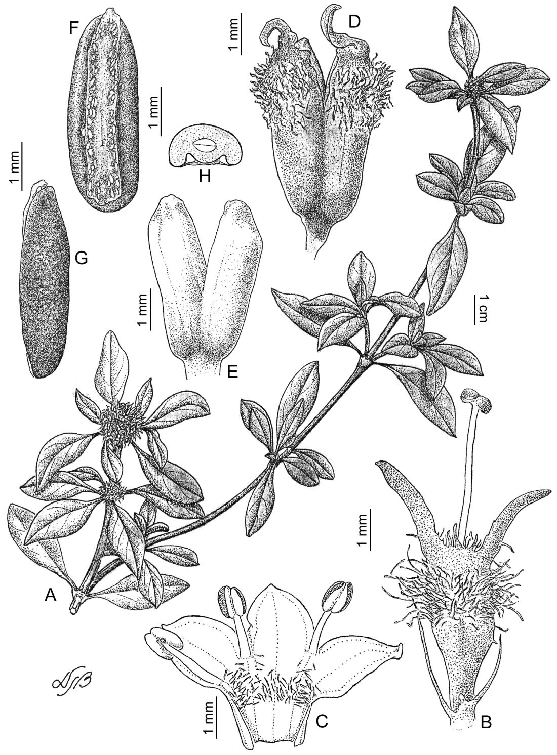 A. Porción de rama florífera. B. Hipanto, cáliz, estilo, estigma. C. Corola desplegada y estambres. D. Cápsula. E. Cápsula madura. F-H. Semilla, vistas ventral, lateral y corte transversal, respectivamente.