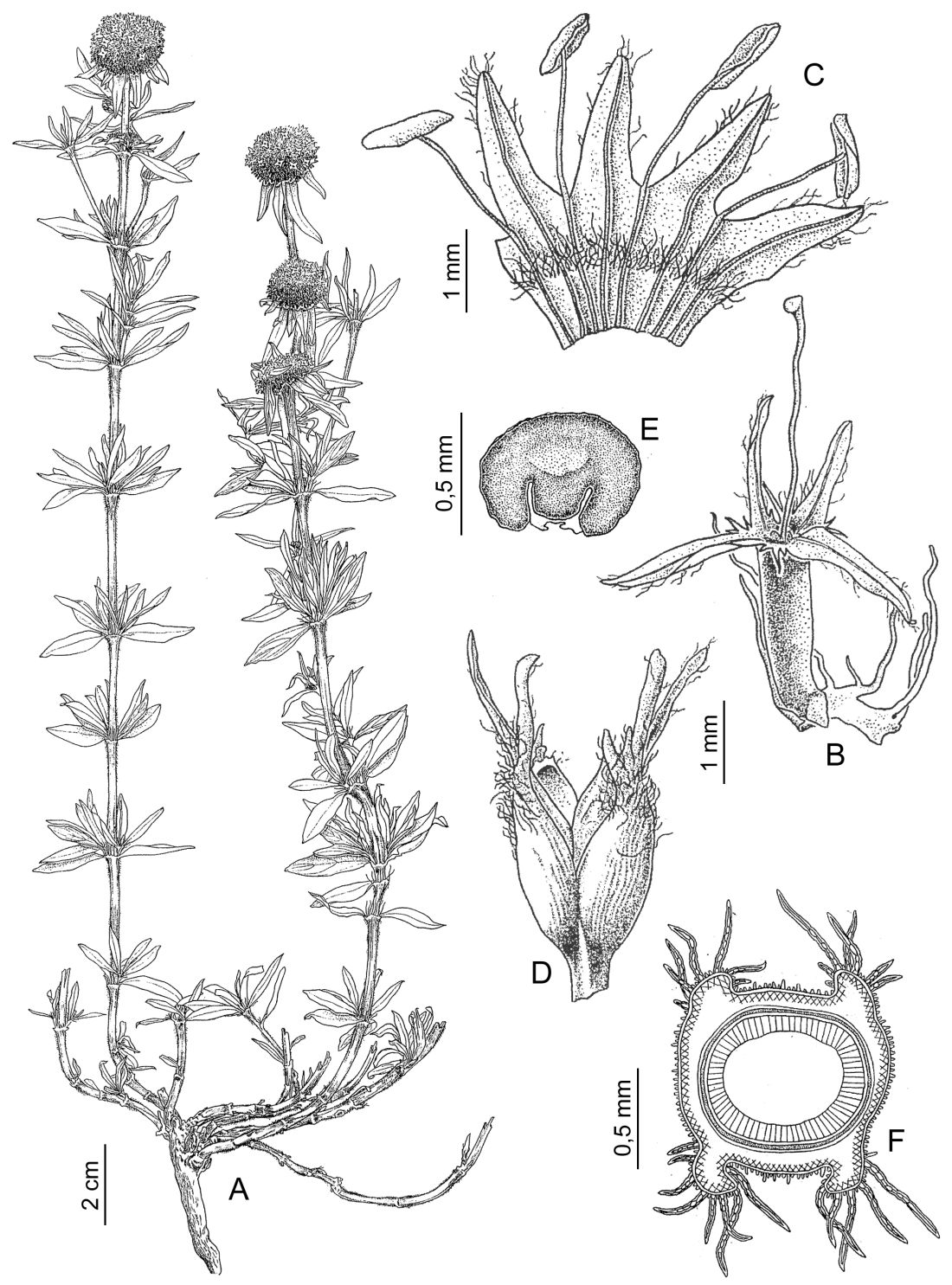 A. Planta. B. Hipanto, cáliz, estilo y estigma. C. Corola desplegada y estambres. D. Cápsula. E. Semilla, corte transversal. F. Tallo, corte transversal. Publicado en Parodiana 4(1): 135, fig. 1. 1986 (sub Borreria quadrifaria).